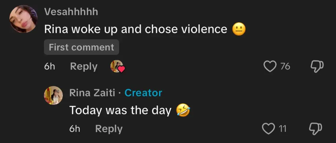 Komentet shpërthyen me humor, ku njëri prej tyre shkruante: “Dmth kokan qel zyrtarisht aplikimet”, ndërsa një tjetër theksonte: “Rina woke up and chose violence.”