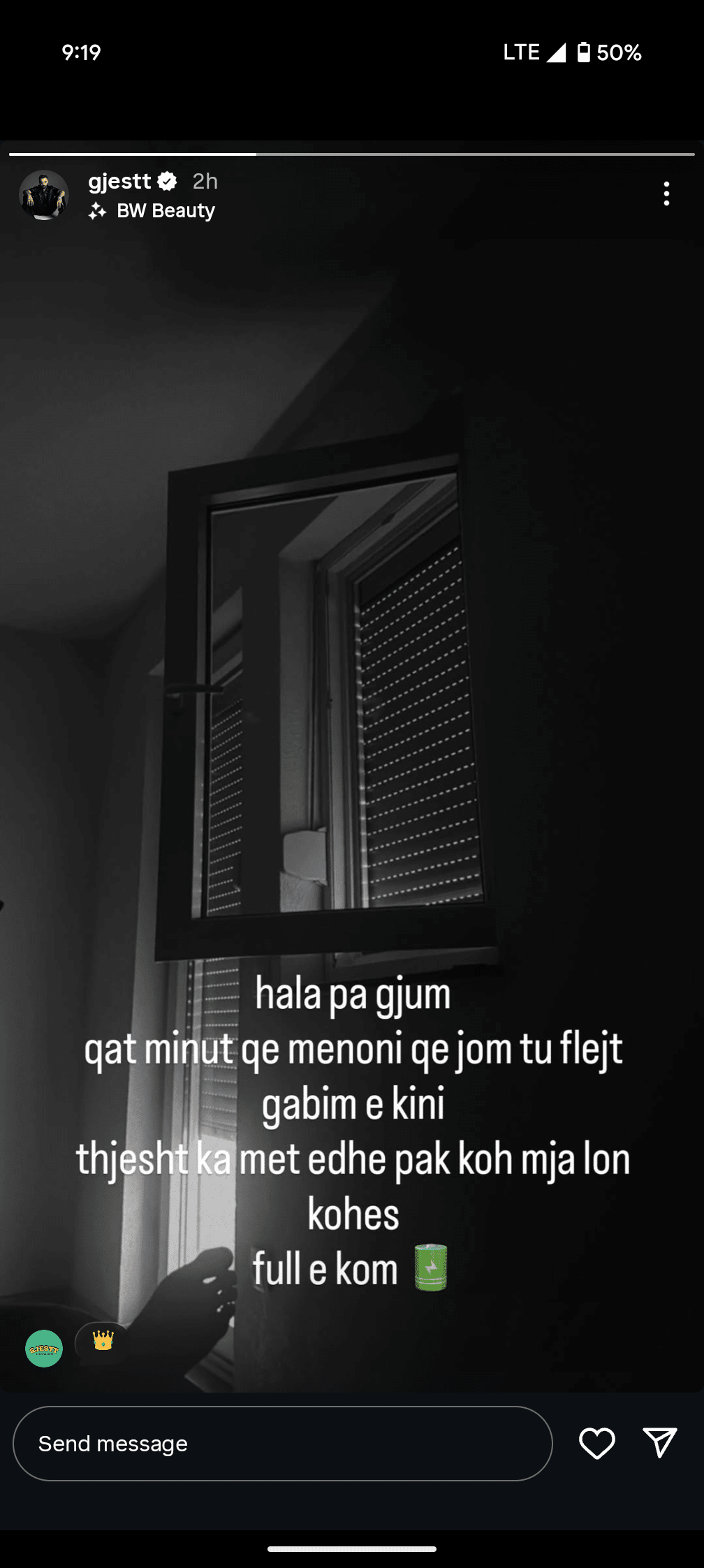 Ai shkroi: “Hala pa gjum qat minut qe menoni qe jom tu flejt gabim e kini thjesht ka met edhe pak koh mja lon kohes full e kom”.