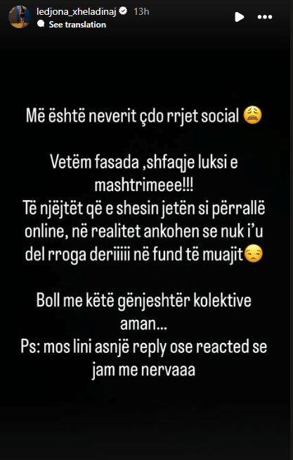 Në një postim në “Instastory”, ajo shkruan se është neveritur nga rrjetet sociale, pasi sipas saj aty dominojnë shfaqjet e luksit dhe mashtrimet.