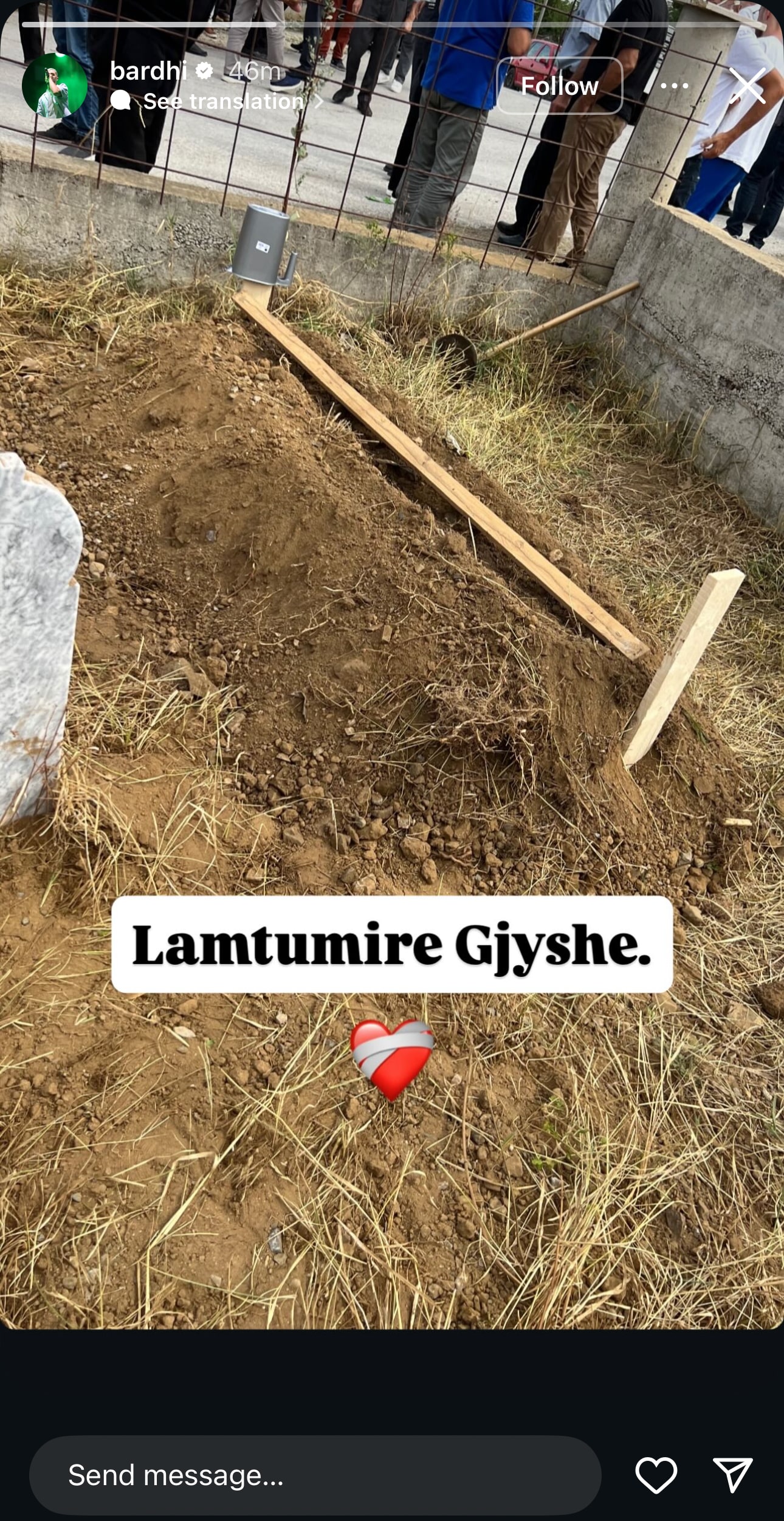 Përmes një postimi në rrjetin social Instagram, Bardhi ka publikuar një fotografi nga varrezat, duke shoqëruar imazhin me një përshkrim të shkurtër, por të mbushur me emocion: “Lamtumirë gjyshe”.