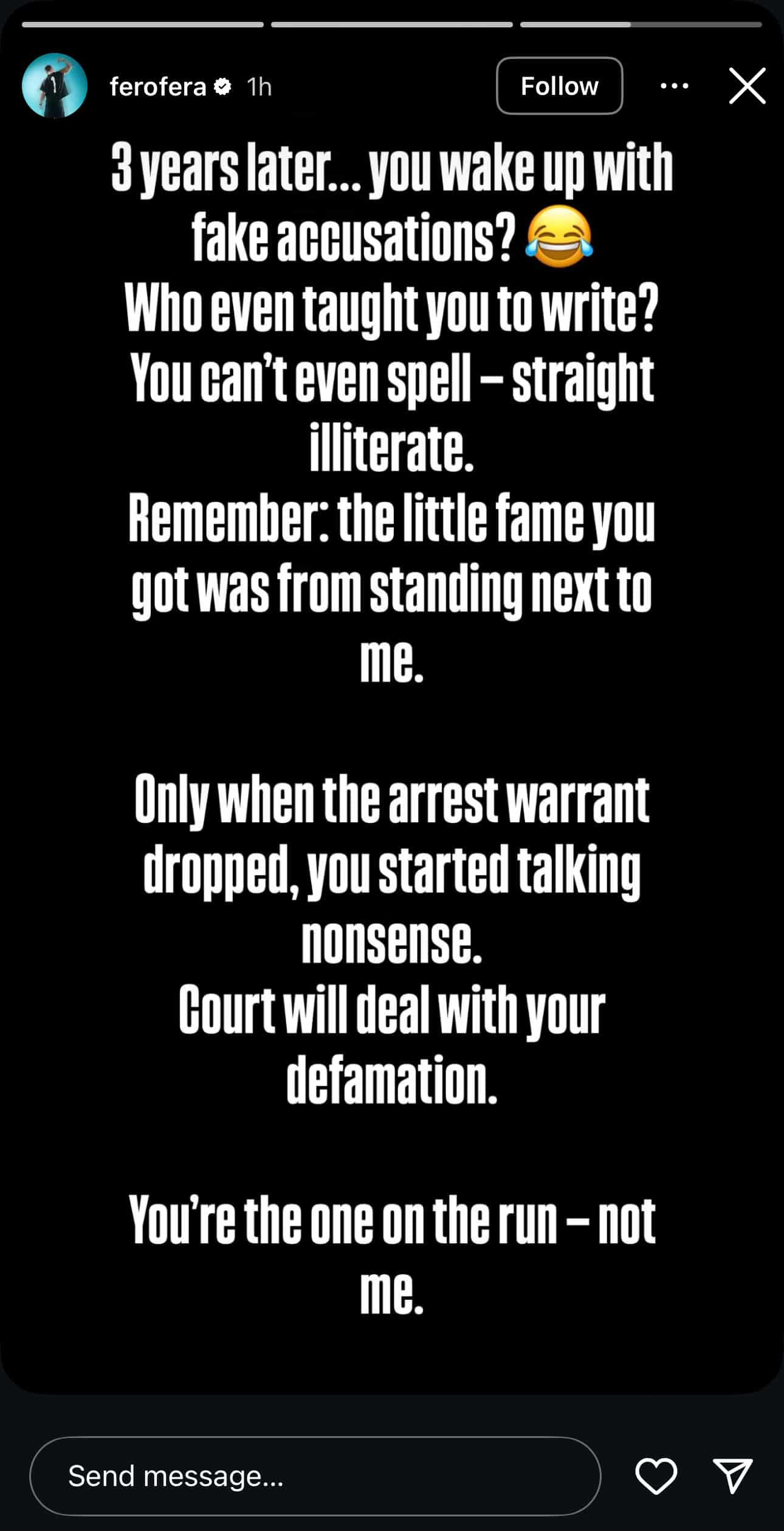 “3 vite më vonë… tani zgjohesh me akuza të rreme? Kush të ka mësuar të shkruash? As të shkruash s’din, je analfabete,” shkruan Fero, duke ironizuar Arbenitën.