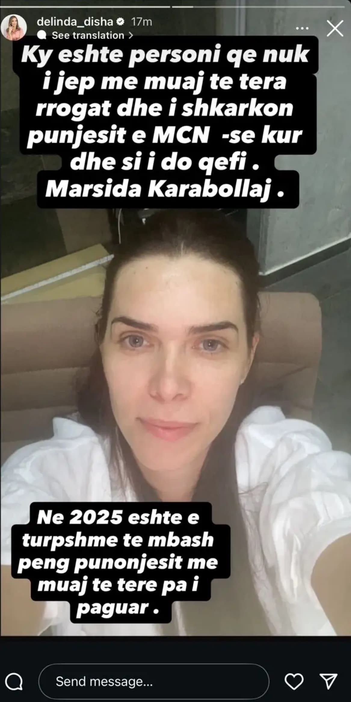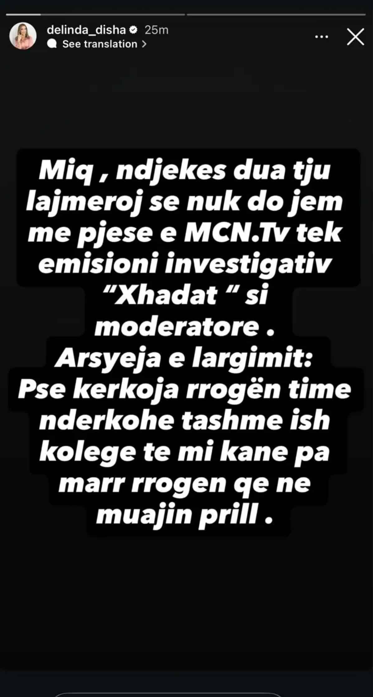“Miq, ndjekës, dua t’ju lajmëroj se nuk do jem më pjesë e MCN TV tek emisioni investigativ ‘Xhadat’ si moderatore. Arsyeja e largimit: Pse kërkoja rrogën time, ndërkohë tashmë ish-kolegët e mi kanë marrë rrogën që në muajin prill.” – shkruan Disha në postimin e parë që ndau në story.