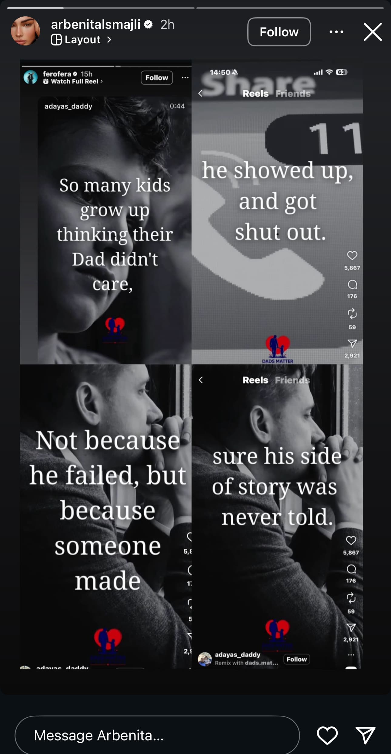 Në një reagim të gjatë e të rëndë në Instagram, ajo ka listuar akuza që kanë lënë pa fjalë publikun, akuza të cilat vijnë pasi Fero kishte publikuar një postim ku shprehej se “shumë fëmijë rriten me idenë se babai i tyre nuk interesohet për ta, sepse dikush i sigurua që ana e tij e historisë mos të thuhej kurrë”.