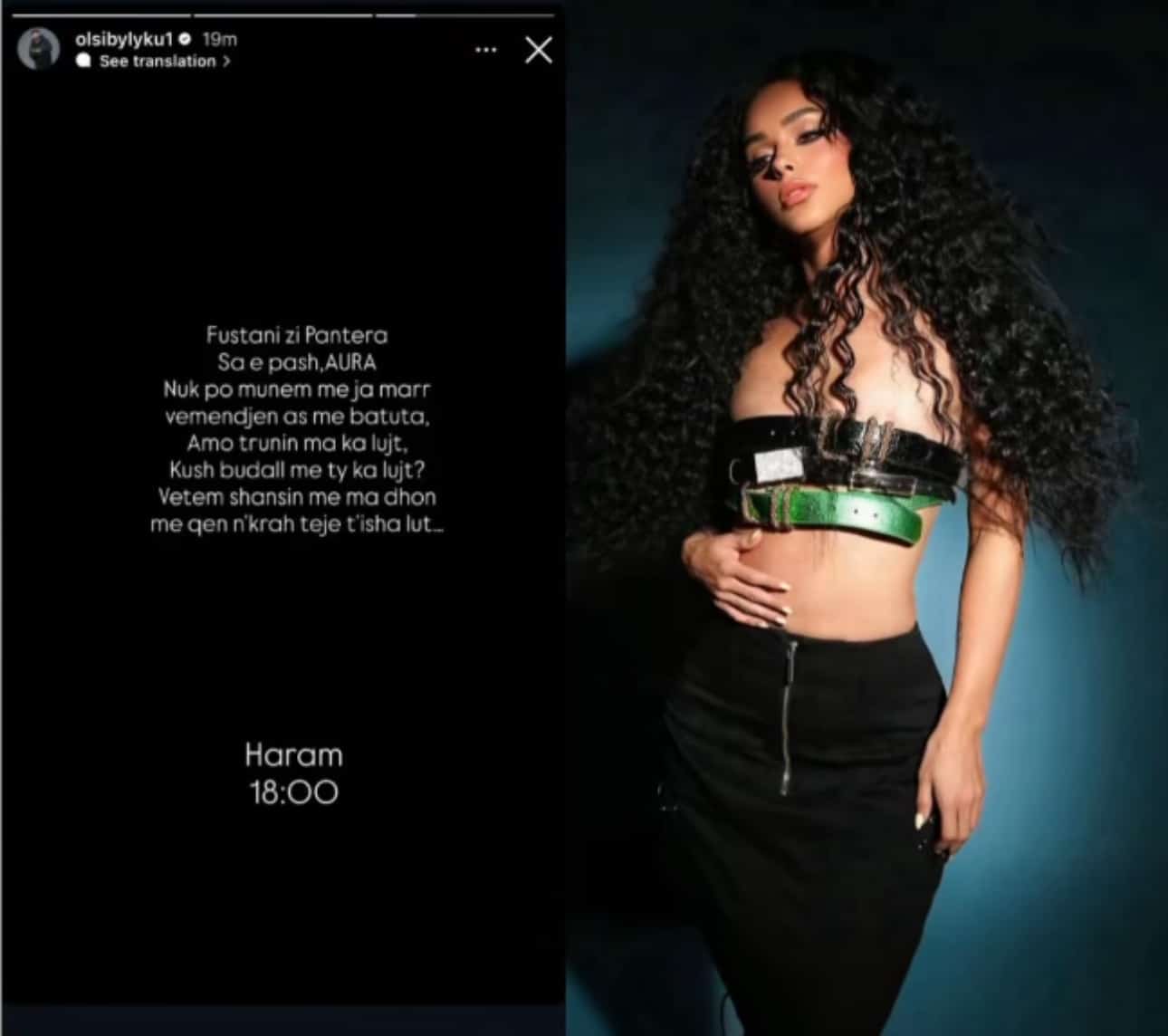 Pak ditë më parë, Egli ndau në Instagram disa foto ku shfaqej me një fund të zi, duke i shoqëruar me mbishkrimin “AURA”. Vetëm një ditë më pas, Olsi publikoi një pjesë nga teksti i këngës së tij më të re “Haram”, ku ndër vargje lexohej: