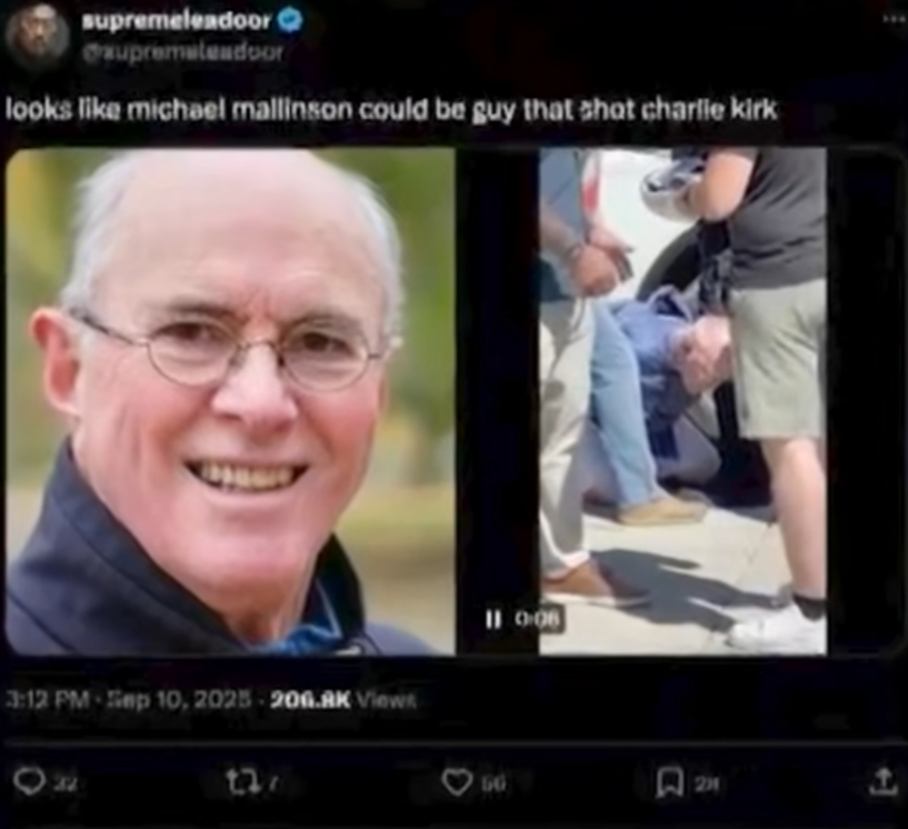 Një 77-vjeçar nga Toronto, Michael Mallinson, është përfshirë gabimisht në ngjarjen e bujshme të vrasjes së aktivistit konservator Charlie Kirk, pasi emri dhe fotografia e tij u shpërndanë në rrjet si i dyshuari kryesor.