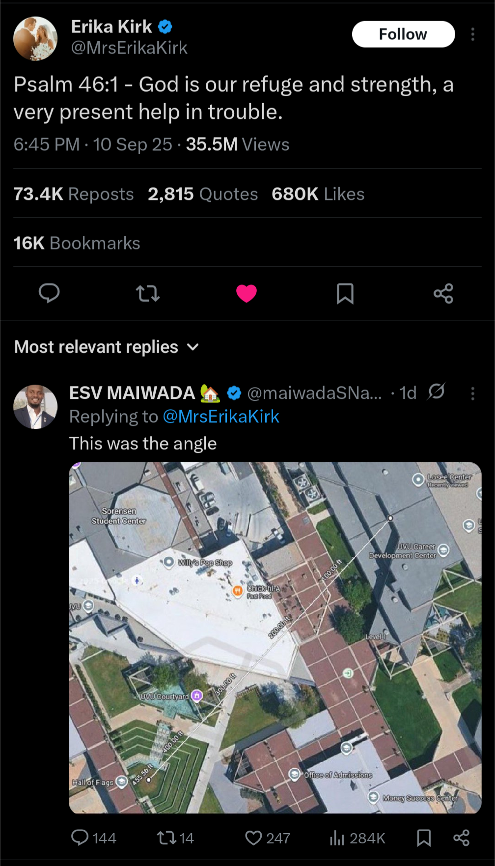 Pak orë para atentatit ku humbi jetën, aktivisti konservator amerikan Charlie Kirk, gruaja e tij Erika Kirk postoi në X (ish-Twitter) një varg nga Bibla: “Psalm 46:1 – God is our refuge and strength, a very present help in trouble.”