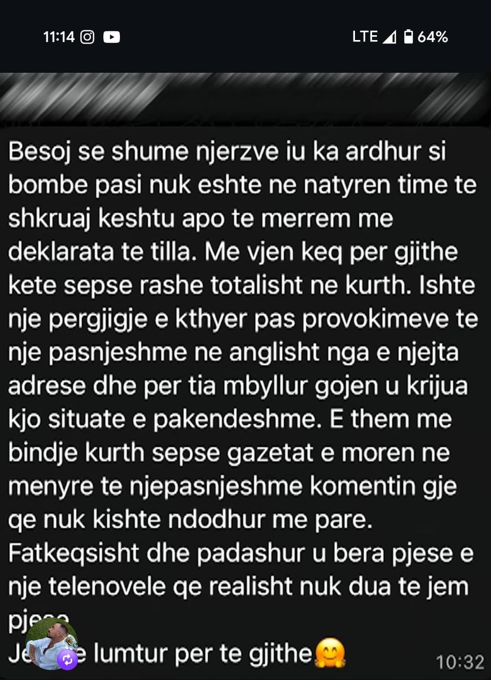 “Besoj se shumë njerëzve iu ka ardhur si bombë, pasi nuk është në natyrën time të shkruaj kështu apo të merrem me deklarata të tilla. Më vjen keq për gjithë këtë, sepse rashë totalisht në kurth. Ishte një përgjigje e kthyer pas provokimeve të njëpasnjëshme në anglisht nga e njëjta adresë dhe për t’ia mbyllur gojën u krijua kjo situatë e pakëndshme,” shkroi Murati.