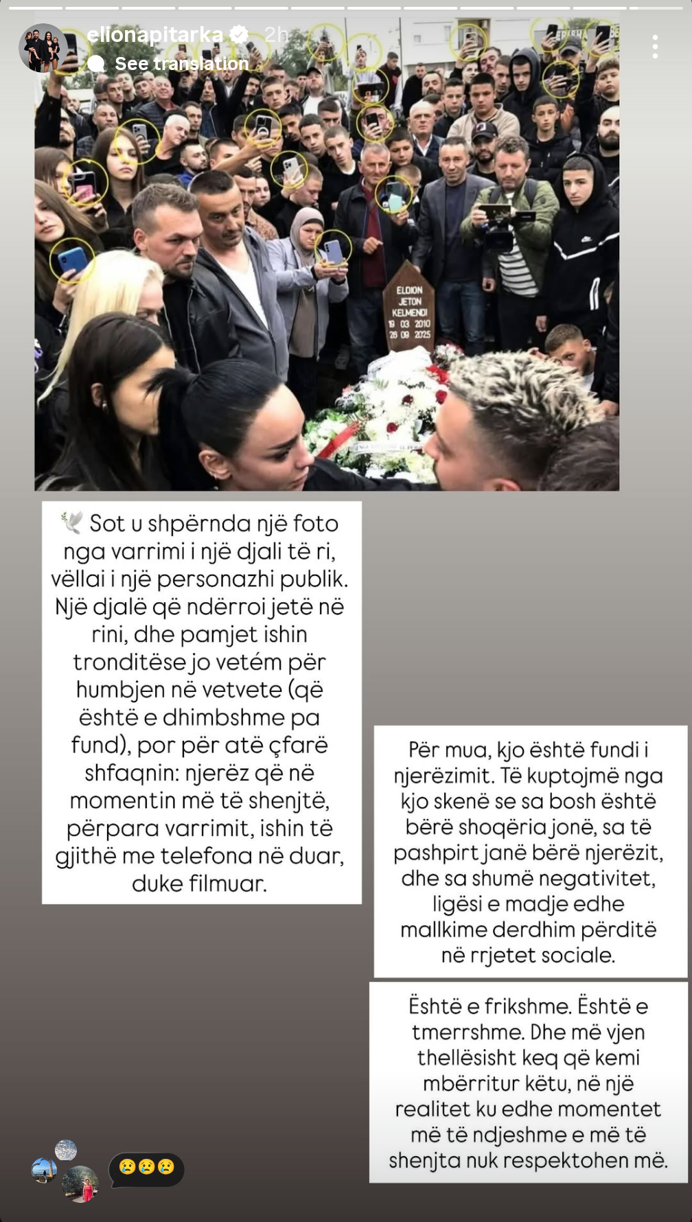 “Sot u shpërnda një foto nga varrimi i një djali të ri, vëllai i një personazhi publik. Një djalë që ndërroi jetë në rini, dhe pamjet ishin tronditëse jo vetém për humbjen në vetvete (që është e dhimbshme pa fund), por për atë çfarë shfaqnin: njerëz që në momentin më të shenjtë, përpara varrimit, ishin të gjithë me telefona në duar, duke filmuar.
