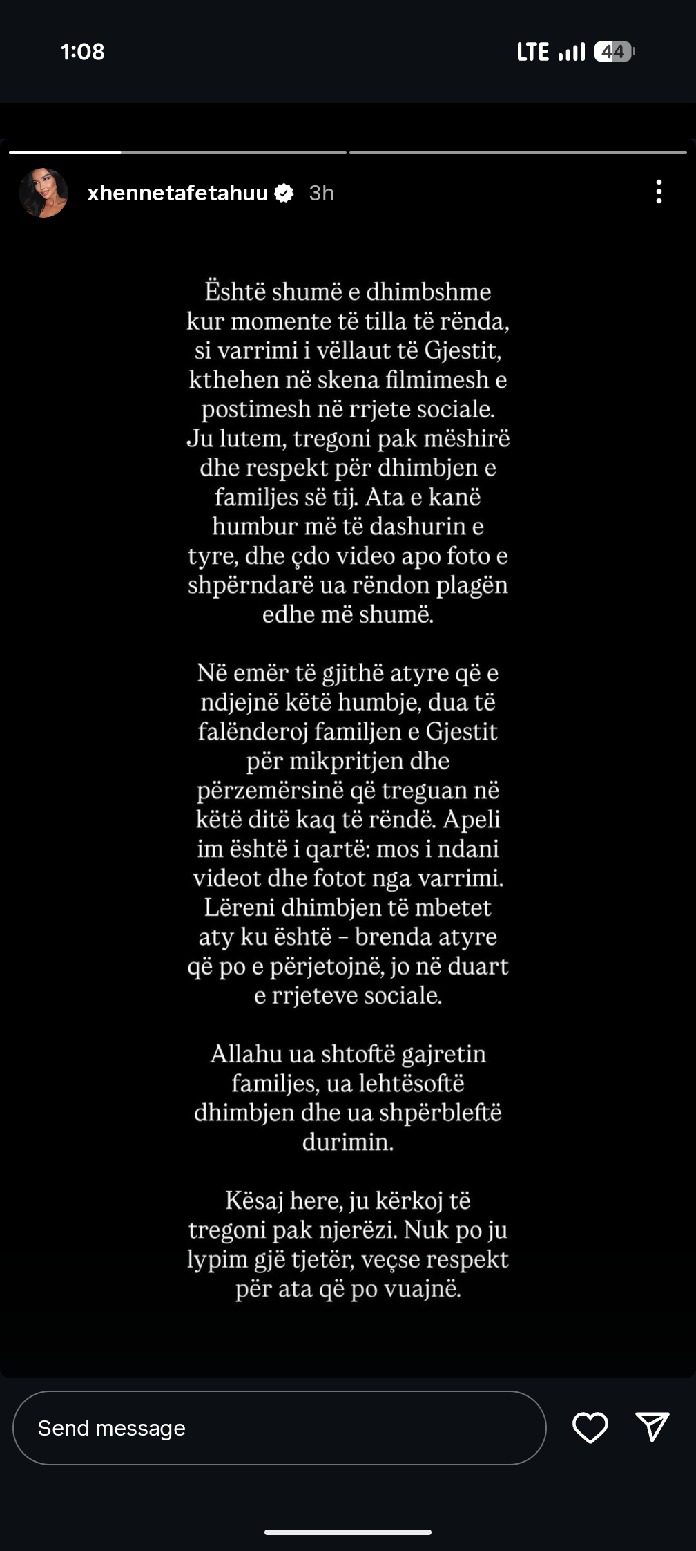 “Është shumë e dhimbshme kur momente të tilla të rënda, si varrimi i vëllaut të Gjestit, kthehen në skena filmimesh e postimesh në rrjete sociale. Ju lutem, tregoni pak mëshirë dhe respekt për dhimbjen e familjes së tij.
