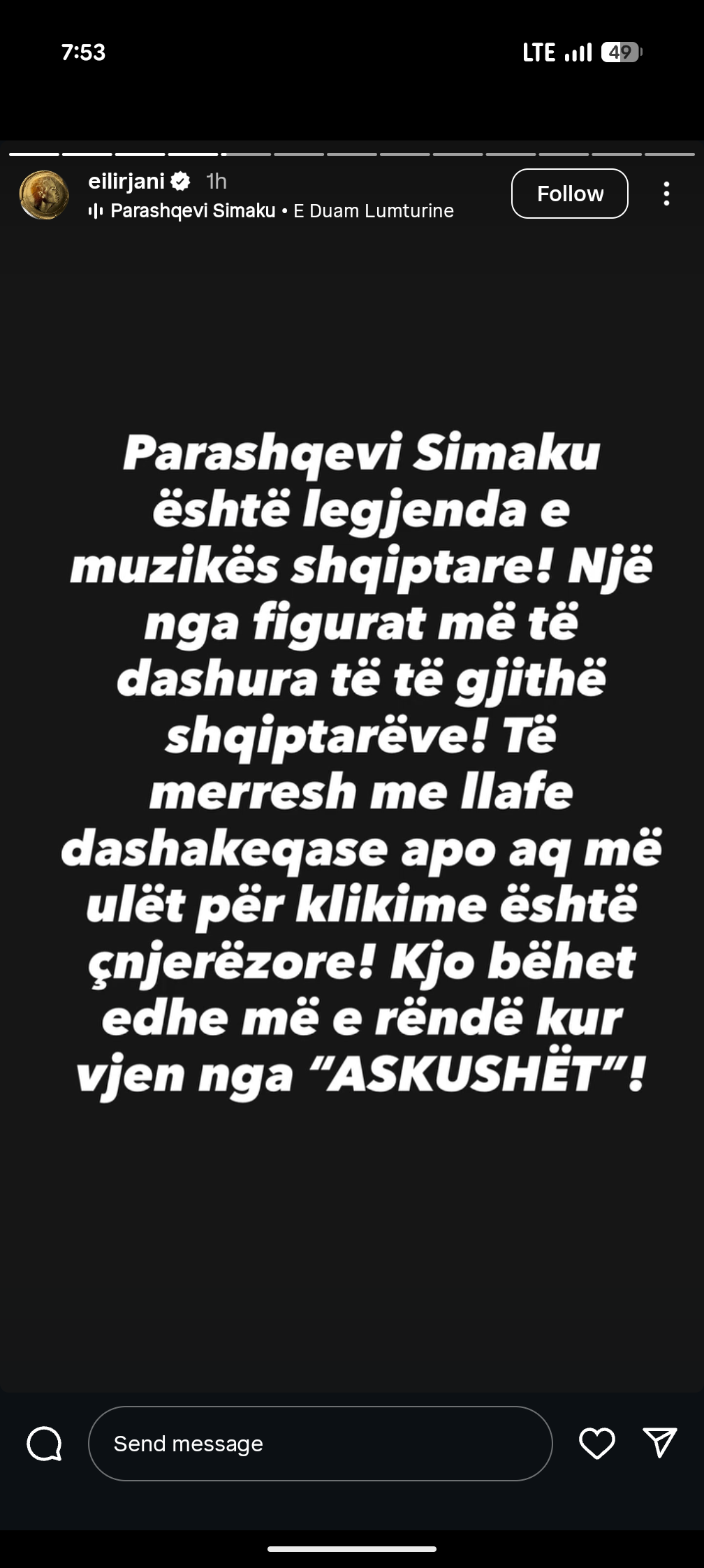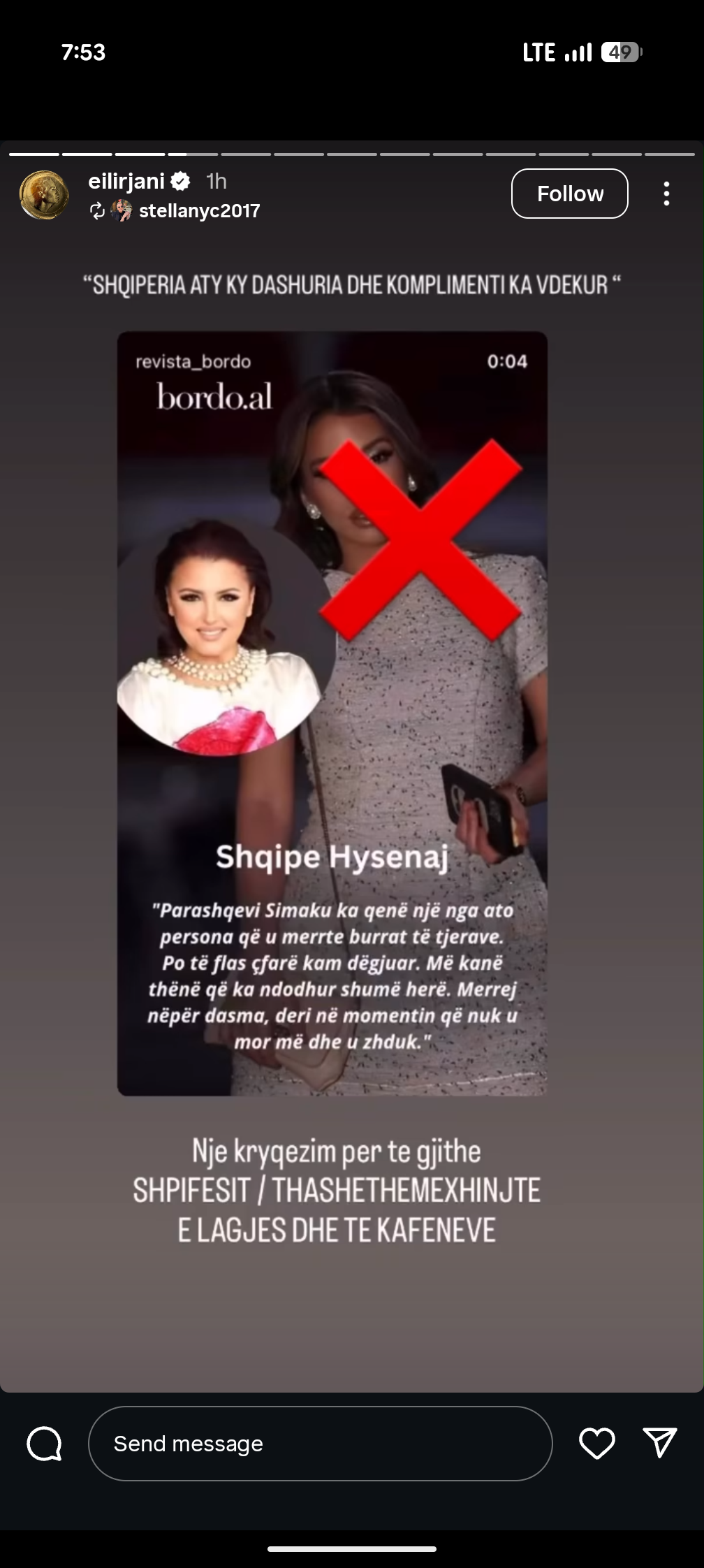 Fillimisht, Eltoni shpërndau deklaratën e Shqipes në InstaStory dhe shkroi ashpër: “Shqiperia aty ky dashuria dhe komplimenti ka vdekur”. Ai shtoi se ky është një “kryqëzim për të gjithë shpifësit/thashethemexhinjtë e lagjes dhe të kafeneve”.