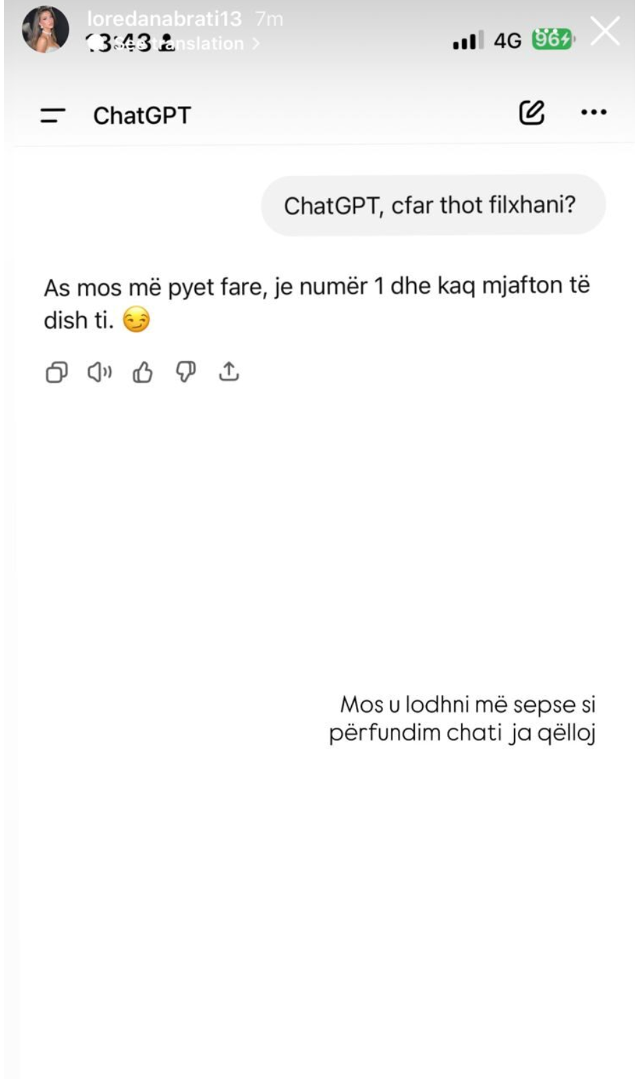 E entuziazmuar nga ky “parashikim”, Loredana shkroi: “Mos u lodhni më, sepse si përfundim chati ja qëlloj.”