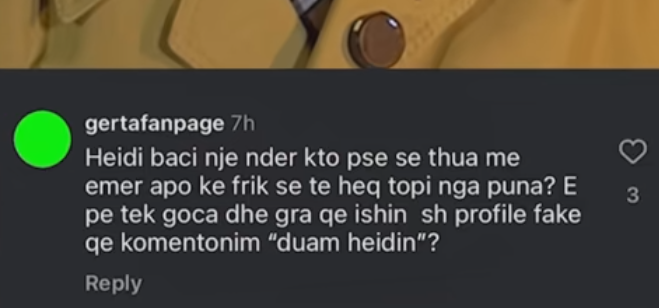 “Heidi Baci një ndër këto pse s’e thua me emër apo ke frikë se të heq Topi nga puna? E pe te ‘Goca dhe Gra’ që ishin profile fake që komentonin ‘duam Heidin’?”, shkruhej në koment.