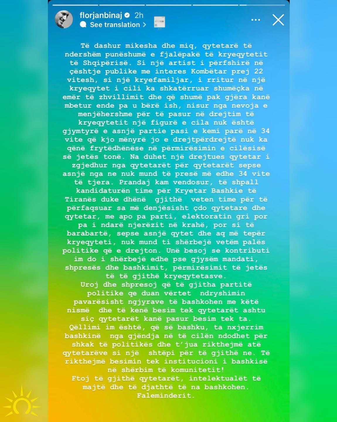 Në një deklaratë publike të bërë në rrjetet sociale, ai u është drejtuar qytetarëve të kryeqytetit duke theksuar se vendimi i tij vjen pas më shumë se dy dekadash përfshirje në çështje me interes publik dhe kombëtar.