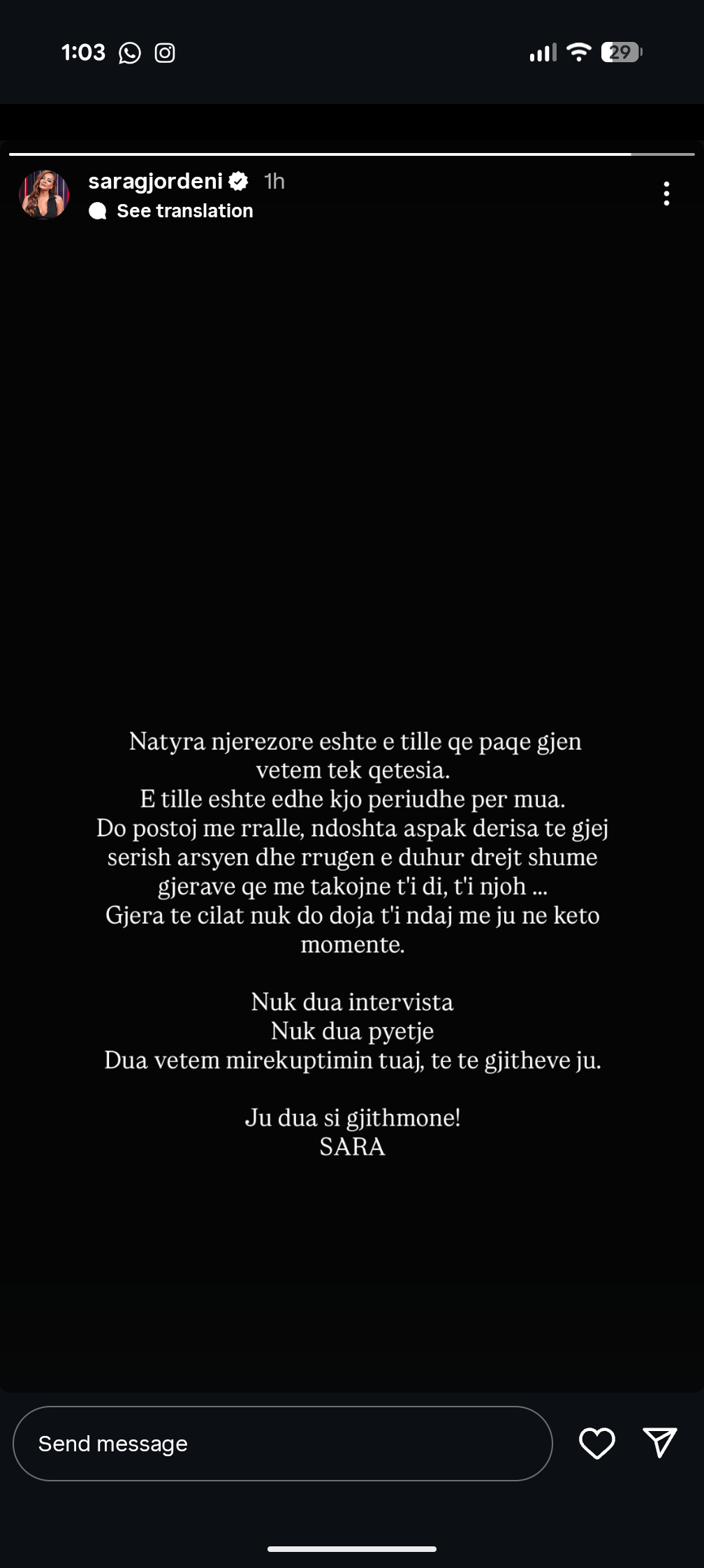 Ish-banorja e “Big Brother VIP Albania”, Sara Gjordeni, ka bërë një njoftim të papritur në rrjetet sociale, duke iu drejtuar ndjekësve me një mesazh ku tregon se do të jetë më pak aktive për një periudhë.
