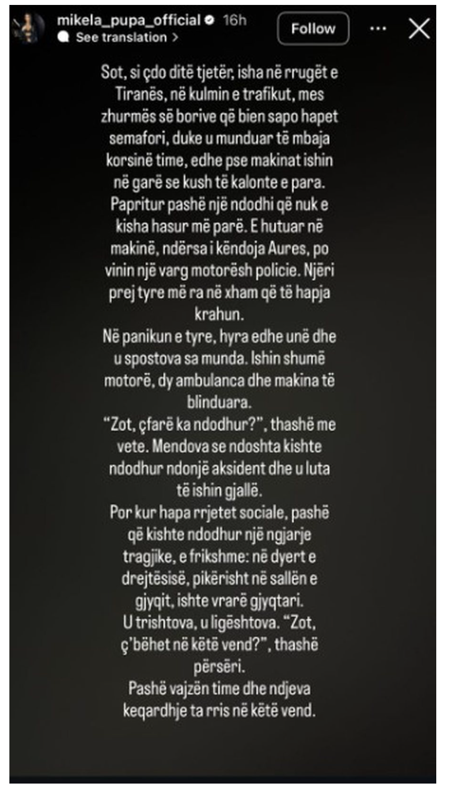 Në një postim në Instagram, Mikela ka treguar se ndodhej në trafik kur pa një autokolonë policore dhe ambulanca që po lëviznin me urgjencë drejt vendngjarjes.