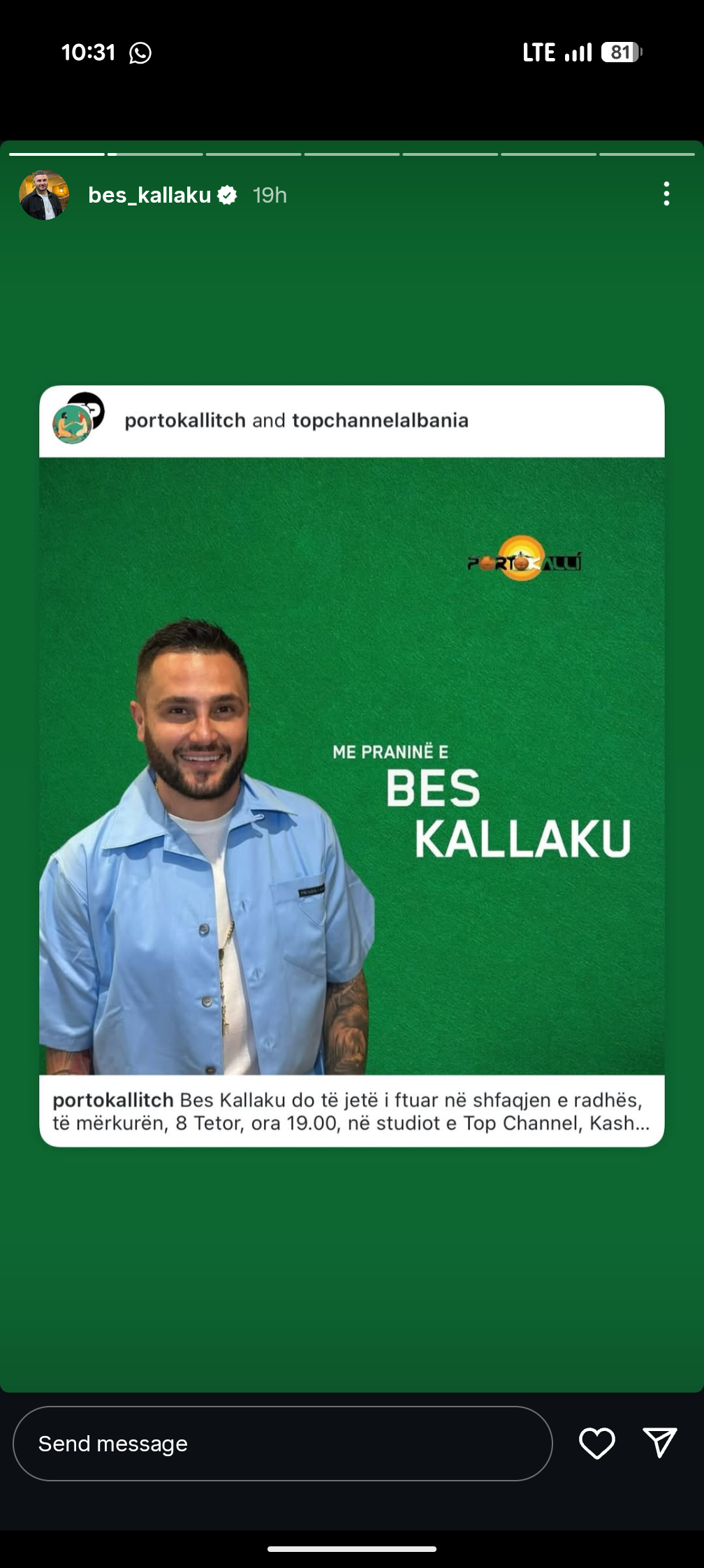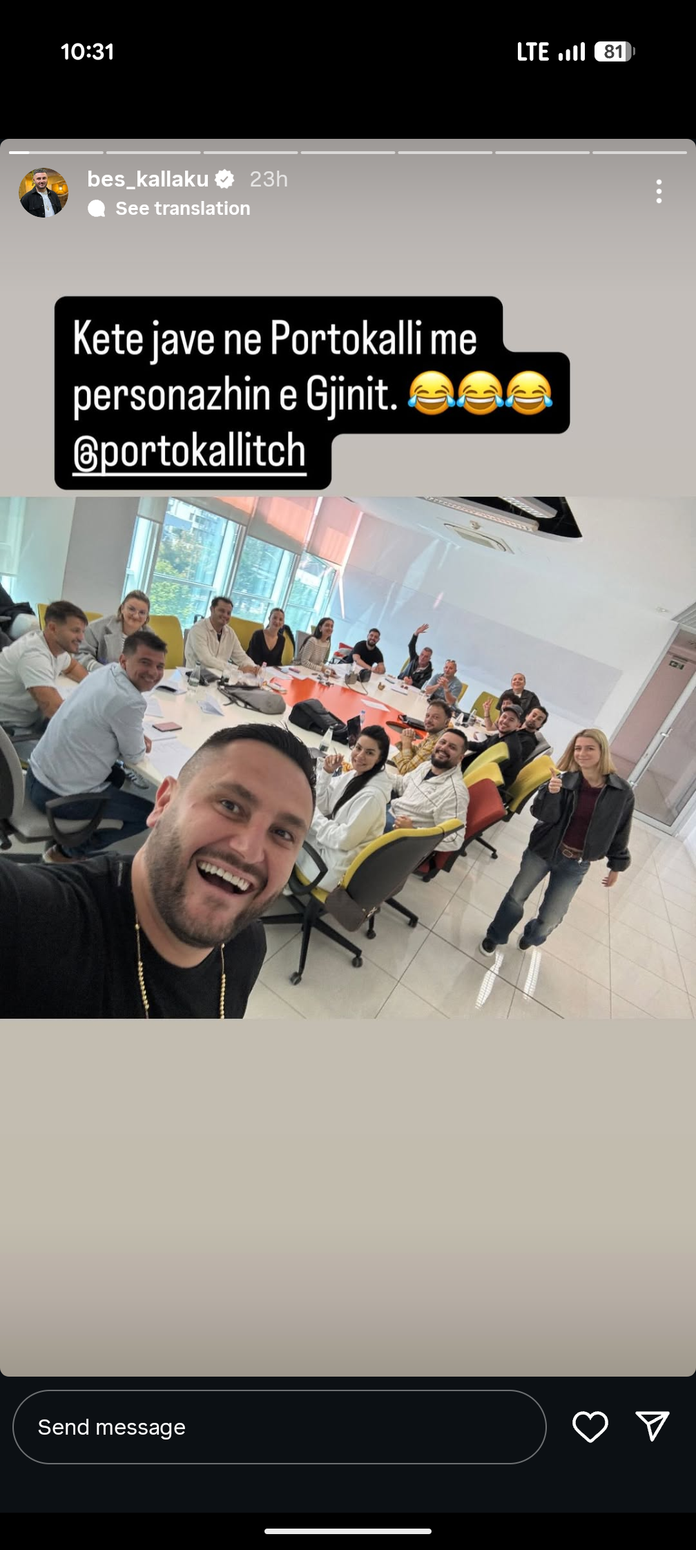 Në njërën prej tyre, ai shfaqet në një foto me stafin e emisionit dhe shkruan: “Kete jave ne Portokalli me personazhin e Gjinit. @portokallitch,” ndërsa në postimin tjetër shpërndau njoftimin zyrtar të emisionit: “Bes Kallaku do të jetë i ftuar në shfaqjen e radhës.”