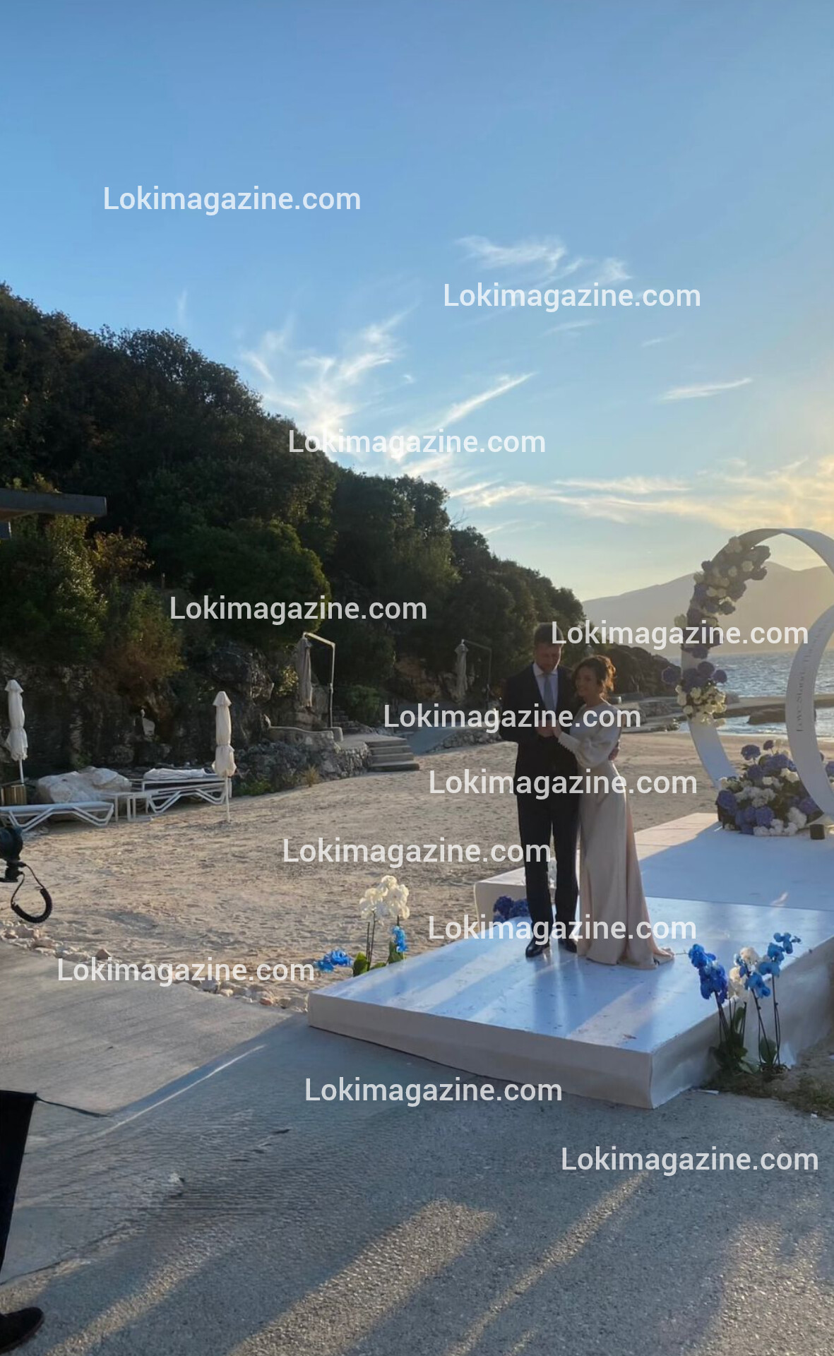 Ceremonia e dasmës është zhvilluar në një mjedis luksoz në Kepin e Merlit, buzë detit, me një dekor mjaft të veçantë. Në njërën prej fotove, çifti shfaqet në një platformë të bardhë, me Blertën që mban veshur një fustan të gjatë me ngjyrë bezhë, ndërsa Leka një kostum elegant.