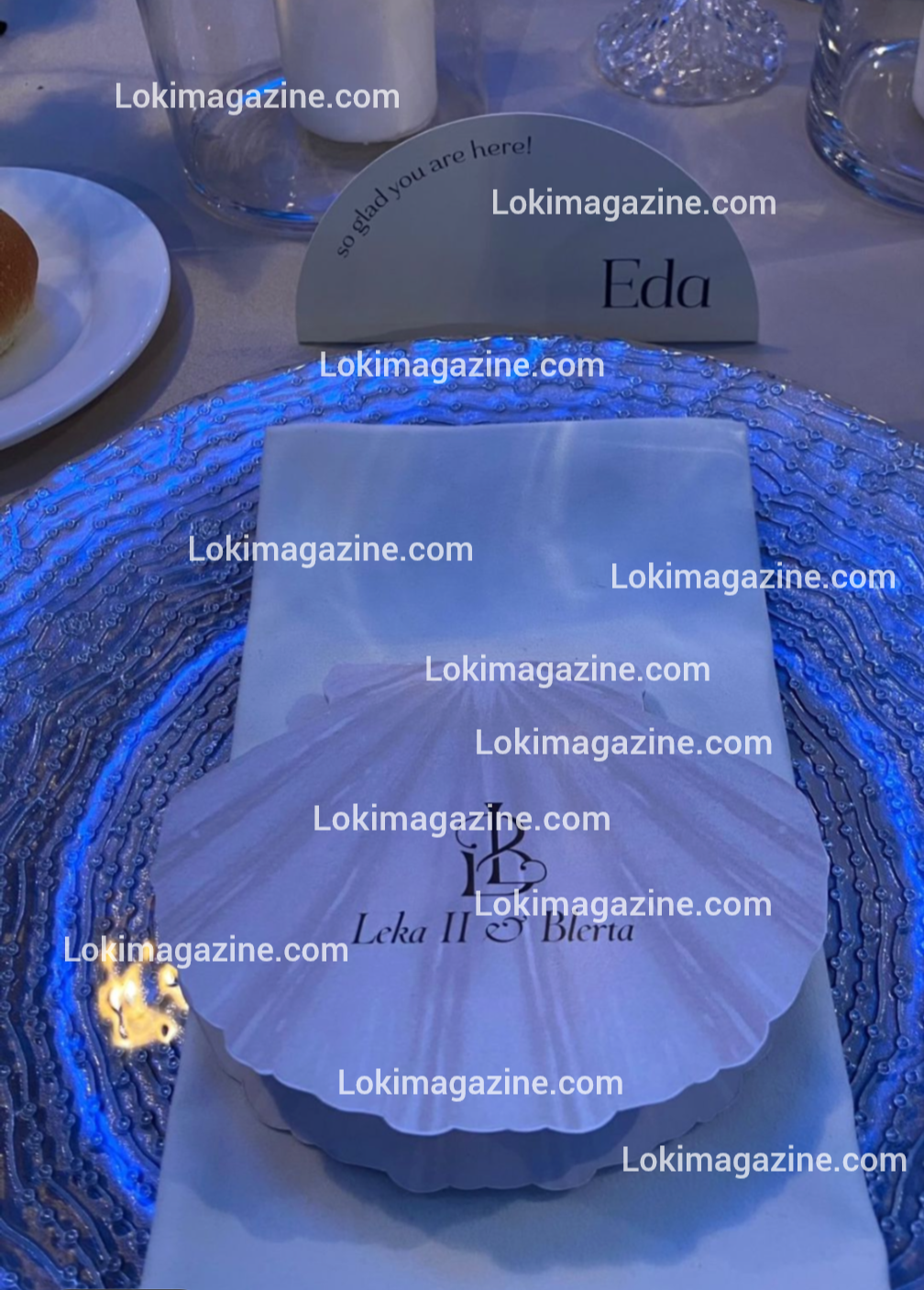 Një tjetër foto tregon detaje nga organizimi i tryezave, ku shfaqet një fletë me emrin “Leka II & Blerta” e dizenjuar në formën e një guaske.