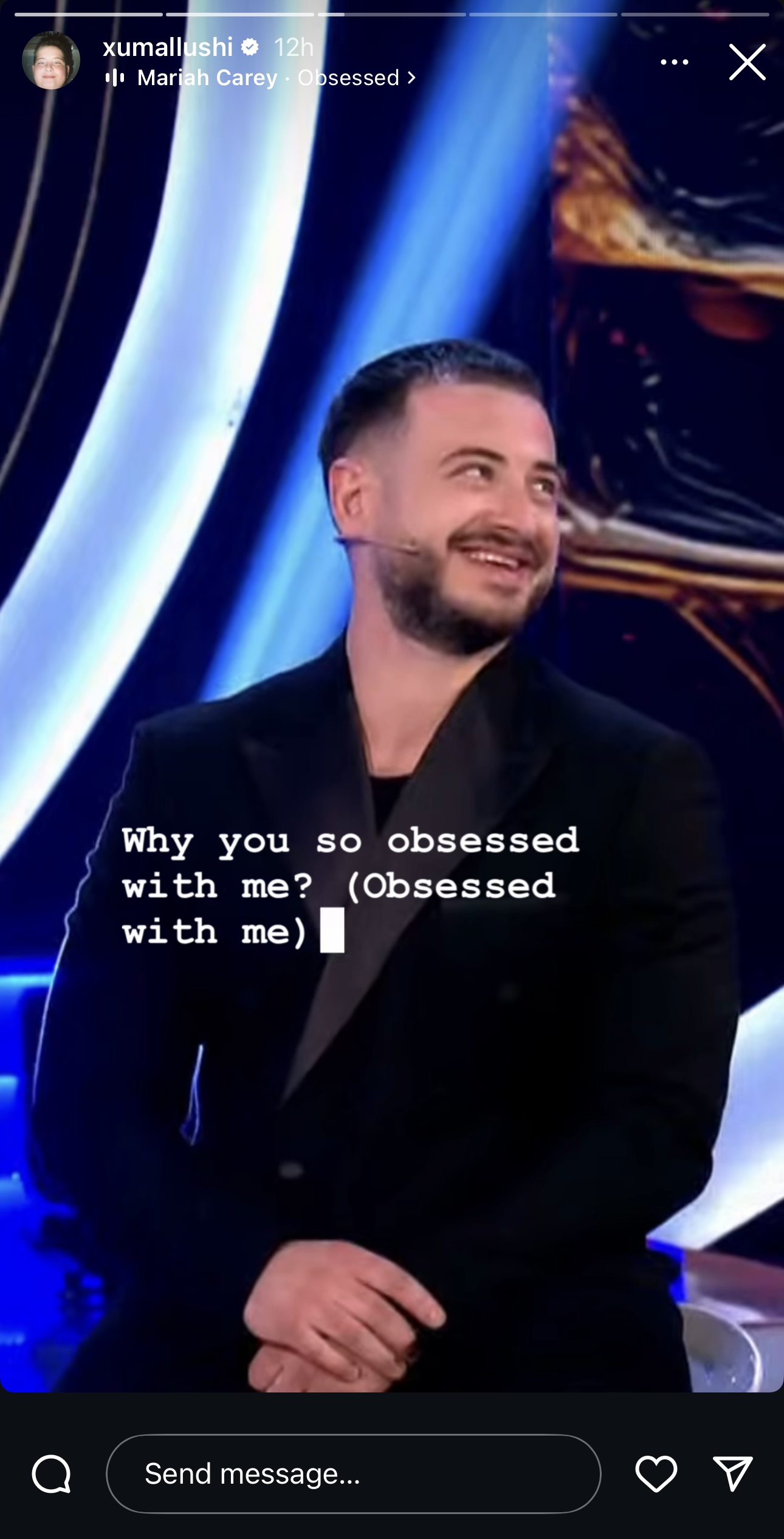 Pas këtij postimi, Xumi reagoi me një foto nga skena e Big Brother VIP, ku shfaqej Ledioni përballë tij, por e kishte prerë duke lënë vetëm veten, ndërsa në sfond kishte vendosur një këngë të njohur të Mariah Carey, që pyet: “Pse je kaq i fiksuar me mua…”