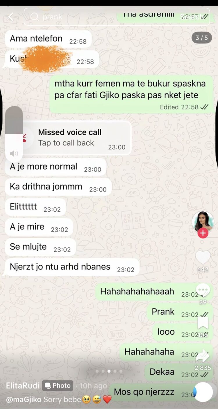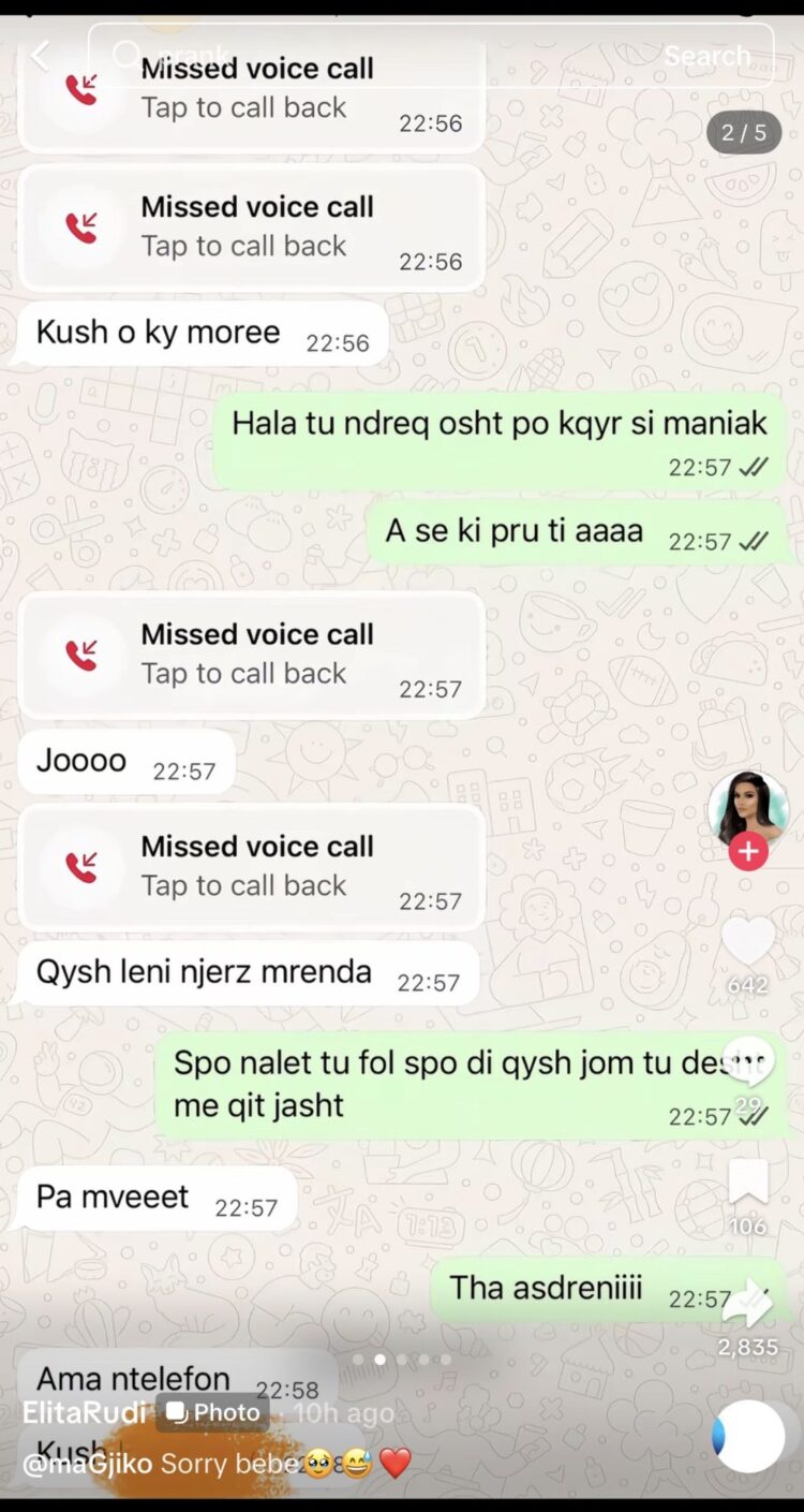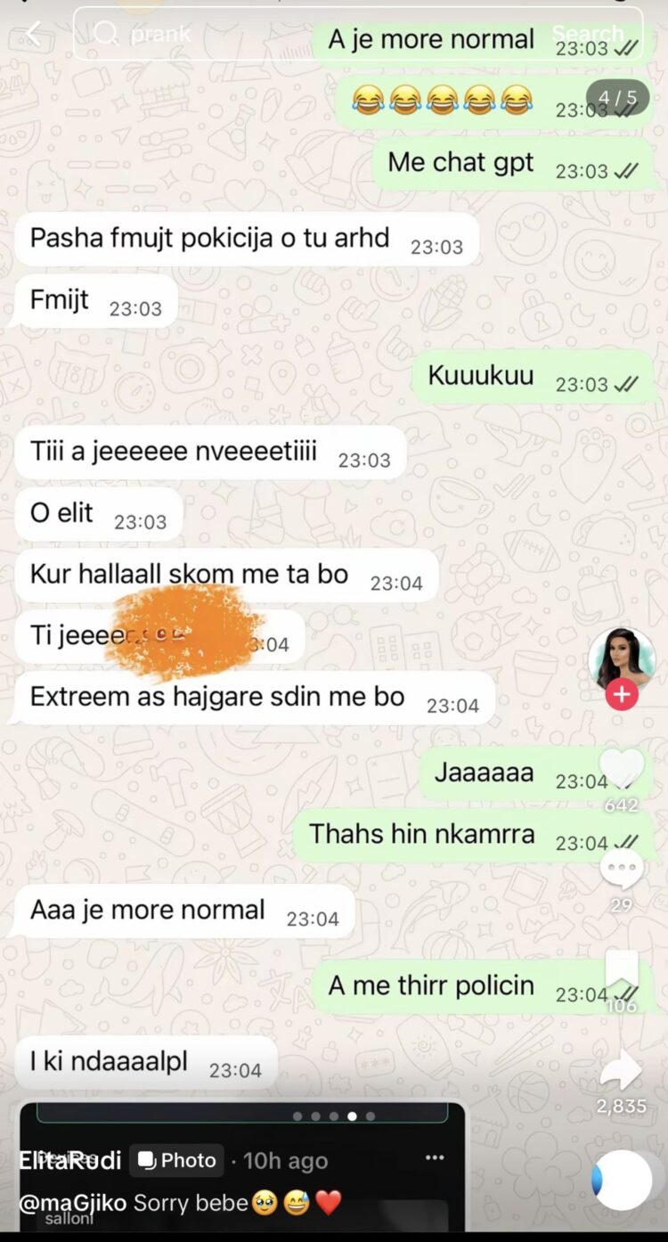 Moderatorja publikoi në TikTok një video ku ndan me ndjekësit një bisedë në WhatsApp, në të cilën i shkruan Gjikos se “një teknik po vinte për të rregulluar diçka në orën 11 të natës”.