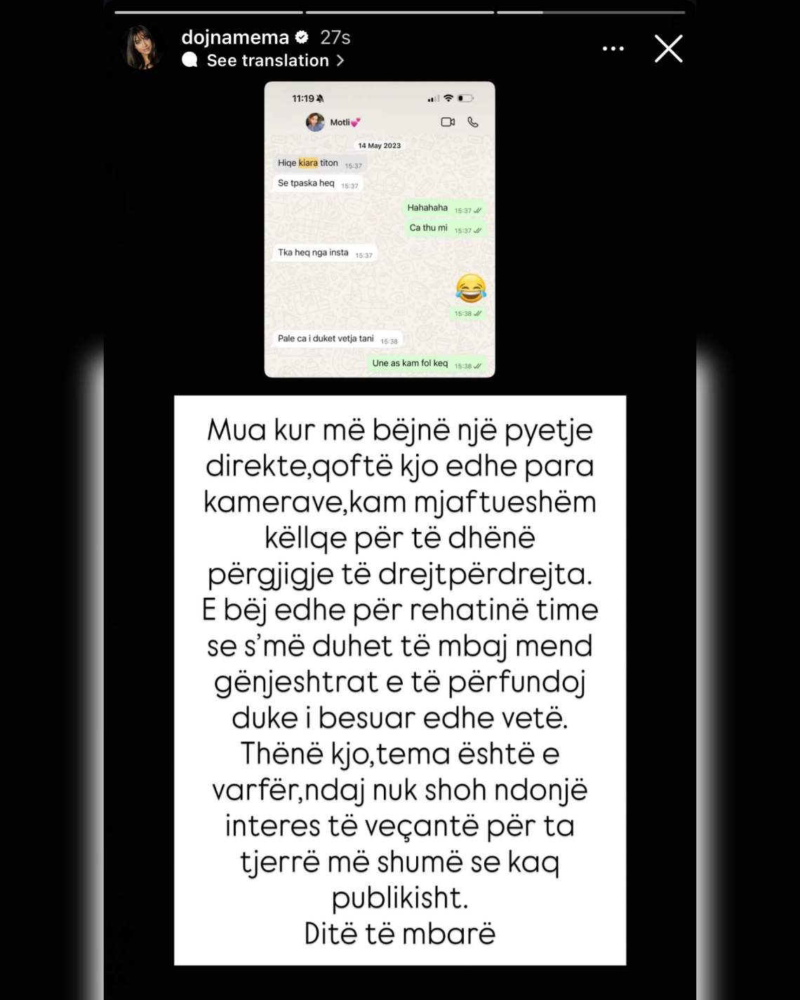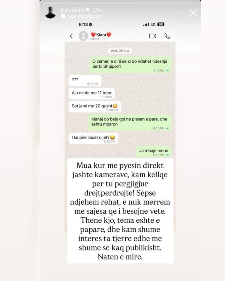 Luizi ndërkohë ka reaguar në InstaStory, ku ka shpërndarë një bisedë mes tij dhe Kiarës.