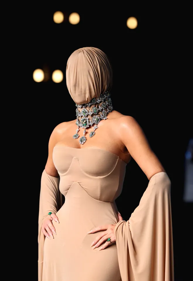 Kardashian është e njohur për zgjedhjet e saj të guximshme dhe shpeshherë kontraverse në modë. Në këtë event, ajo u paraqit me një fustan Margiela me ngjyrë nude dhe një maskë që i mbulonte plotësisht fytyrën, duke tërhequr gjithë vëmendjen e të pranishmëve dhe mediave.