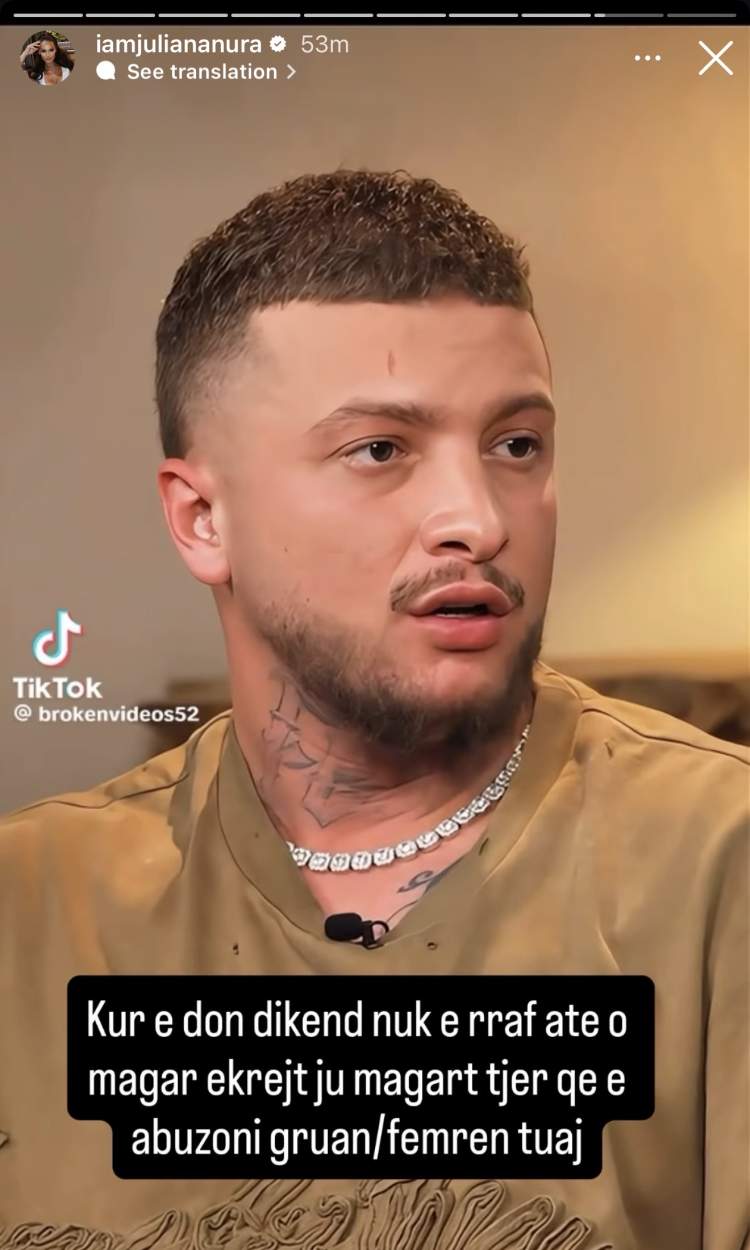 Menjëherë pas këtyre deklaratave, Juliana Nura shpërtheu me një postim në Instastory. Ajo shpërndau një video nga intervista e Feros dhe i shkroi me tone të ashpra, duke sulmuar çdo burrë që abuzon gratë: “Kur e don dikë nuk e rraf atë o magar, e krejt ju magarë tjerë që e abuzoni gruan/femrën tuaj.”