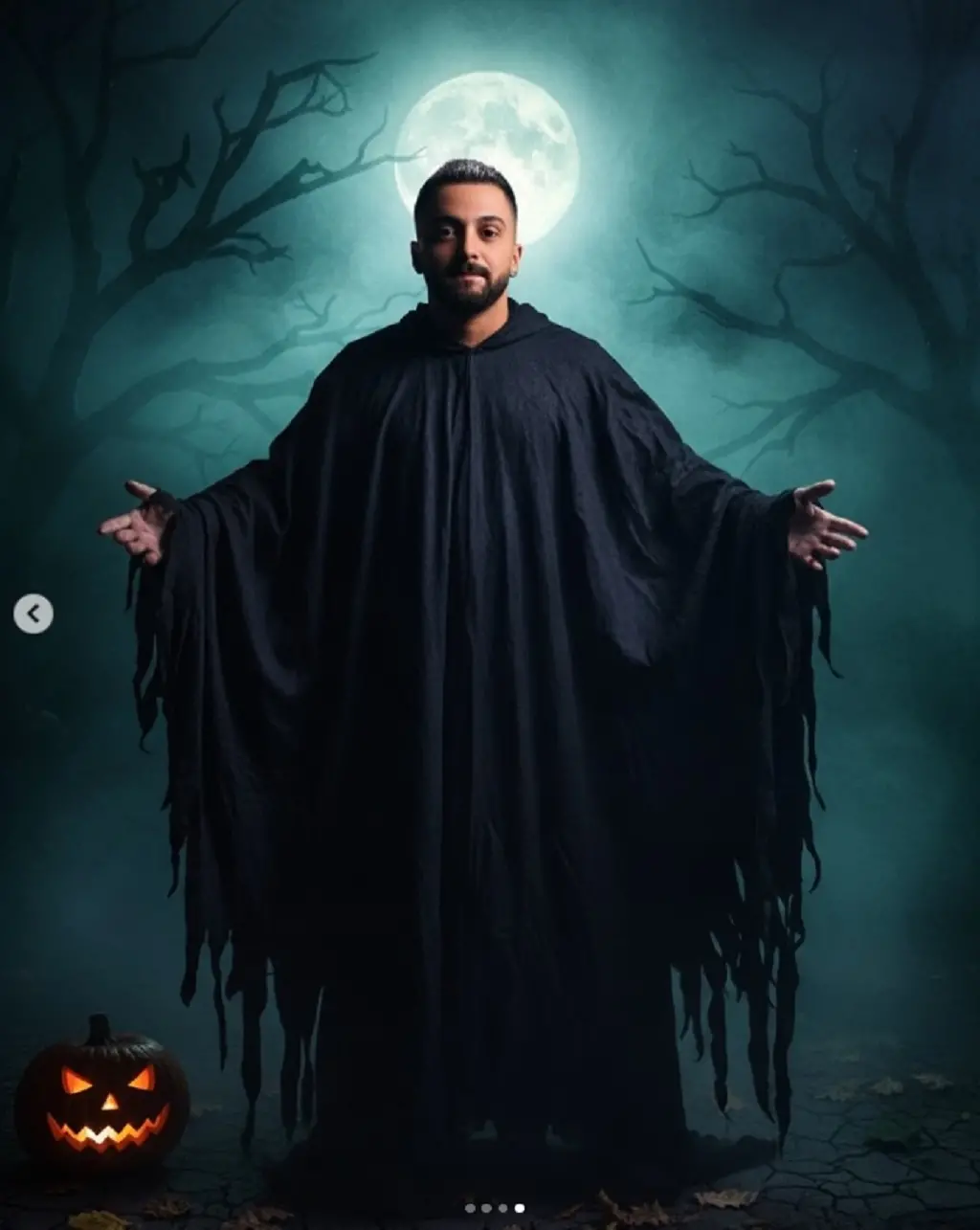 Në imazhin e shpërndarë, Gjesti shfaqet i maskuar për Halloween, me një stil të errët dhe detaje artistike që përshtaten me atmosferën e festës.