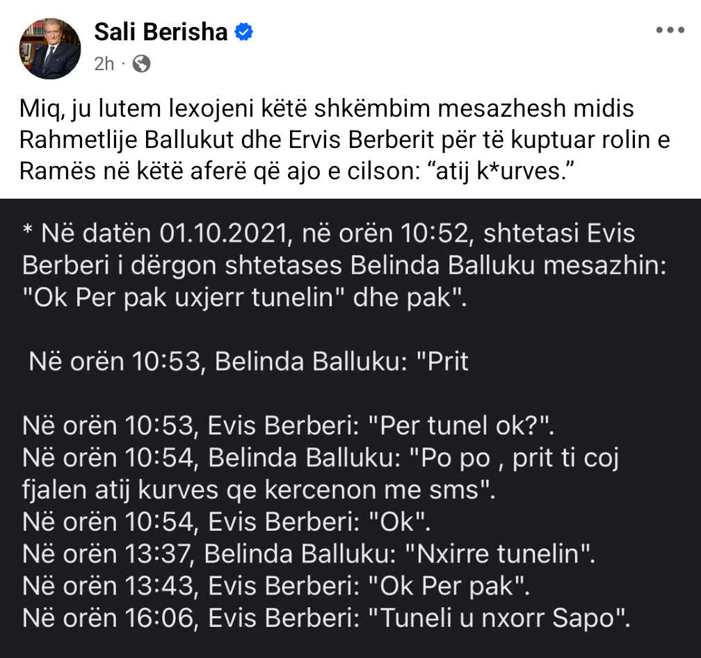 “Miq, ju lutem lexojeni këtë shkëmbim mesazhesh midis Rahmetlije Ballukut dhe Ervis Berberit për të kuptuar rolin e Ramës në këtë aferë që ajo e cilson: atij k*urves.” shkruan Berisha.