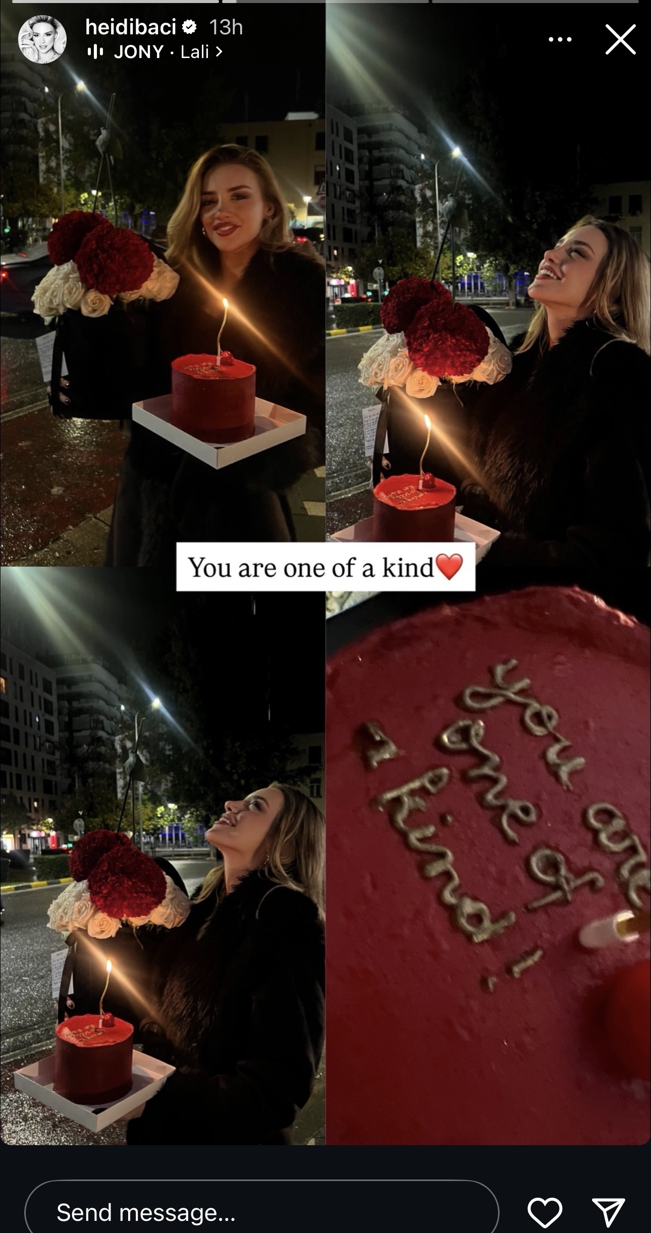 Në fotografitë e publikuara, Heidi shfaqet me një buqetë të madhe lulesh dhe një tortë të personalizuar me dedikim romantik.
