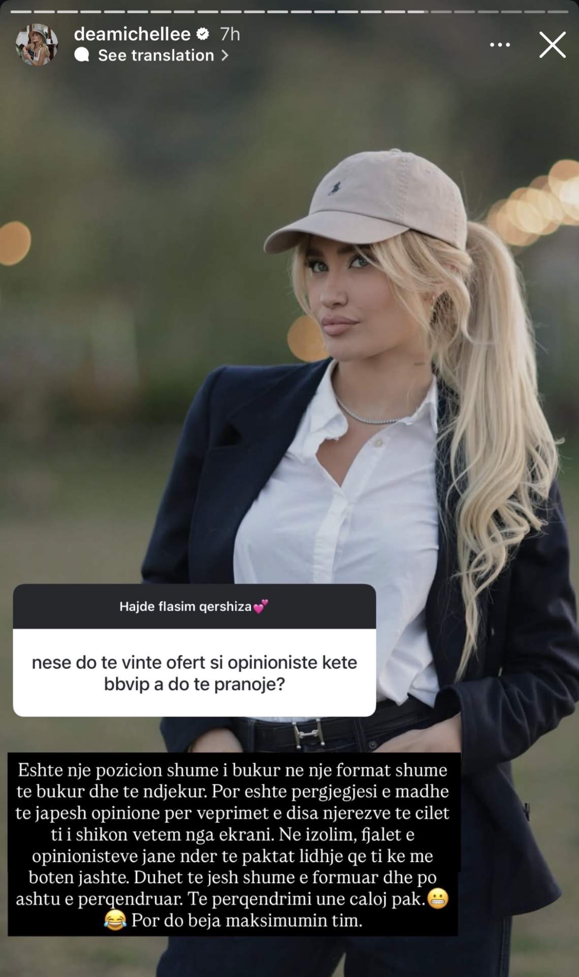 Përmes një sesioni pyetje-përgjigje në Instagram, ish-banorja u shpreh: “Është një pozicion shumë i bukur në një format shumë të bukur dhe të ndjekur. Por është përgjegjësi e madhe të japësh opinione për veprimet e disa njerëzve të cilët ti i shikon vetëm nga ekrani.”