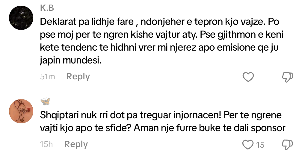 Në të njëjtën linjë, një komentues tjetër shkroi: “Deklarat pa lidhje fare… Pse moj per te ngren kishe vajtur aty. Pse gjithmon e keni kete tendenc te hidhni vrer mi njerez apo emisione qe ju japin mundesi.”