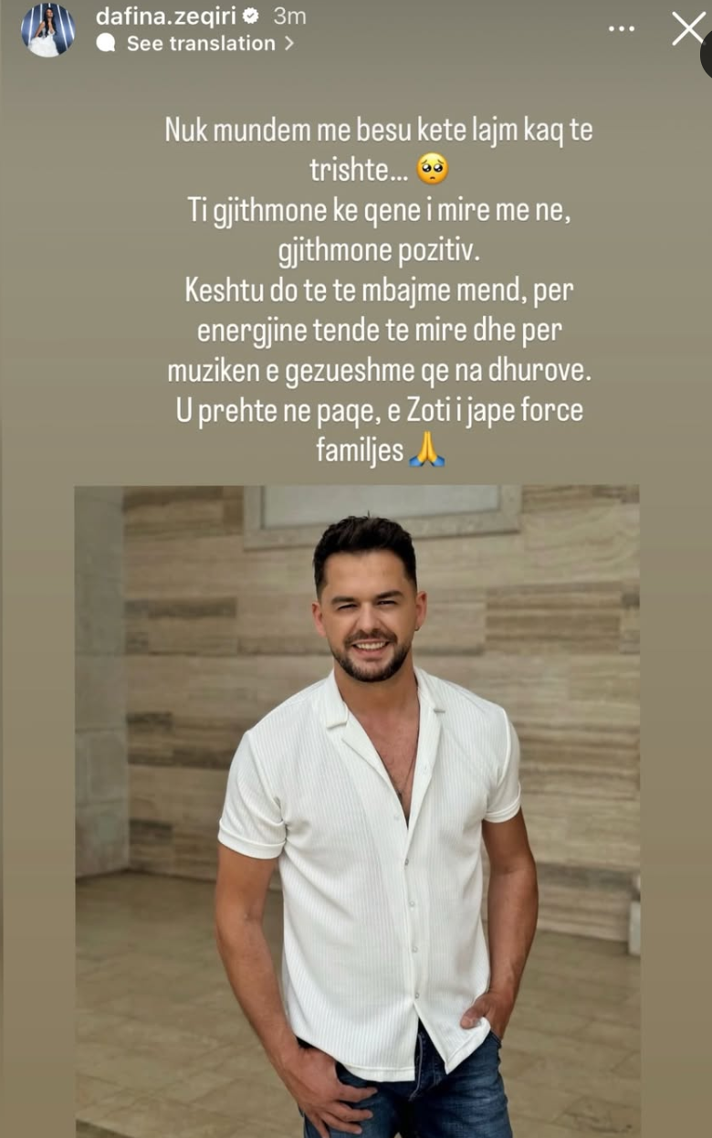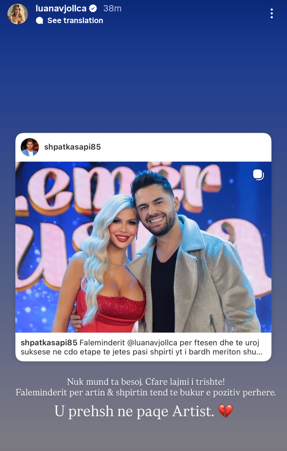 Moderatorja Luana Vjollca publikoi një foto të përbashkët duke shkruar: “Nuk mund ta besoj. Cfare lajmi i trishte! Faleminderit per artin & shpirtin tend te bukur e pozitiv perhere. U prehsh ne paqe Artist.”