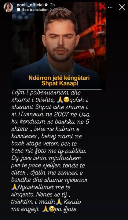 Ndarja e parakohshme nga jeta e këngëtarit Shpat Kasapi ka tronditur thellë kolegët e tij, mes të cilëve edhe këngëtaren e njohur Poni, e cila ka ndarë me publikun kujtime të vjetra dhe komunikimin e fundit me artistin.
