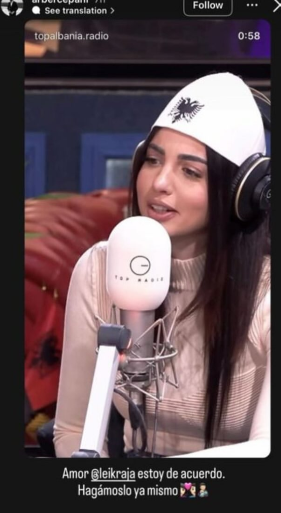 Pas kësaj deklarate që bëri xhiron e rrjetit, nuk ka vonuar përgjigja publike e Arbrit. Përmes një postimi në “Instastory”, ai e ka pranuar “sfidën” duke u përgjigjur: “Dashuri, jam dakord. Le ta bëjmë tani” shkruan ai.