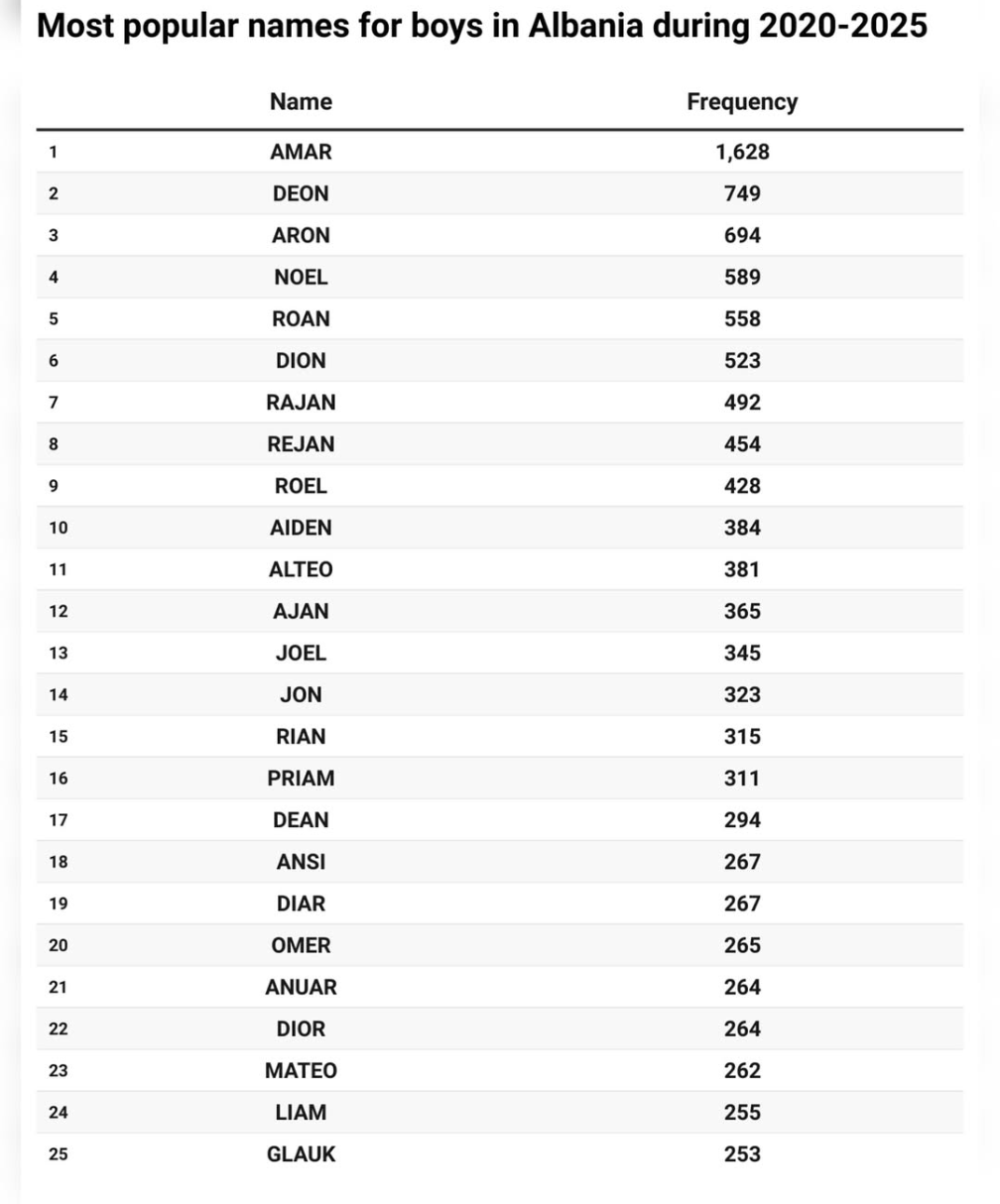 Amar është aktualisht emri më i preferuar për djemtë e sapolindur, ndërsa prindërit po zgjedhin gjithnjë e më shumë emra të shkurtër dhe me origjinë të huaj, si Deon, Aron apo Liam, duke lënë pas emrat tradicionalë shqiptarë si Arben, Gëzim apo Alban.