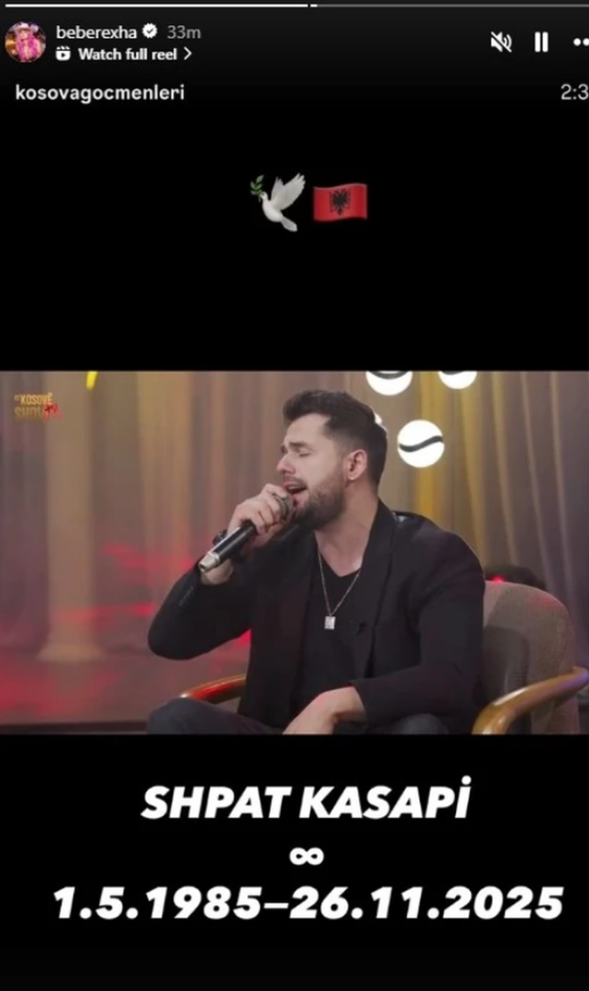 Përmes një postimi në “Instastory”, Bebe ka rishpërndarë një video emocionuese të Shpatit duke kënduar, të cilën e ka shoqëruar me datat e tij të lindjes dhe vdekjes (1.5.1985 – 26.11.2025).