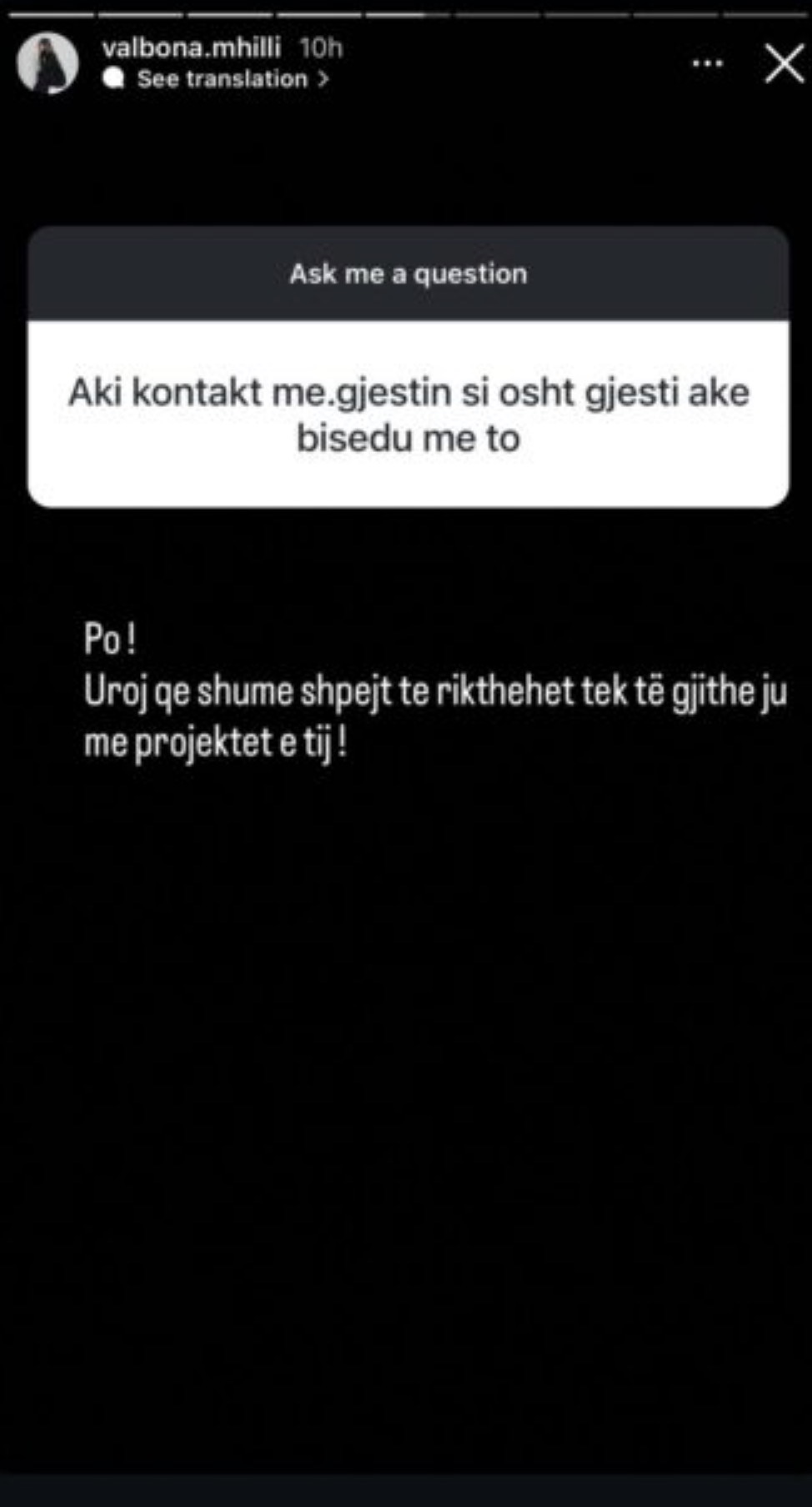 “Po! Uroj që shumë shpejt të rikthehet te të gjithë ju me projektet e tij!”, është përgjigjur Mhilli në një postim në “Instastory”.