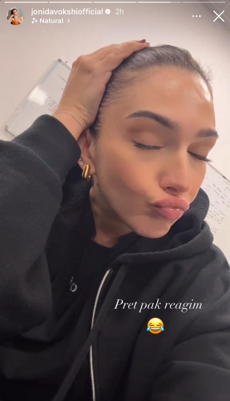 Pas heshtjes fillestare, Jonida ka vendosur të reagojë përmes një postimi në “Instastory”. Ajo ka publikuar një video ku shfaqet e qeshur dhe e qetë, të cilën e ka shoqëruar me ironi pikërisht me frazën e famshme: “Pret pak reagim”, së bashku me një emoji duke qeshur me lot.