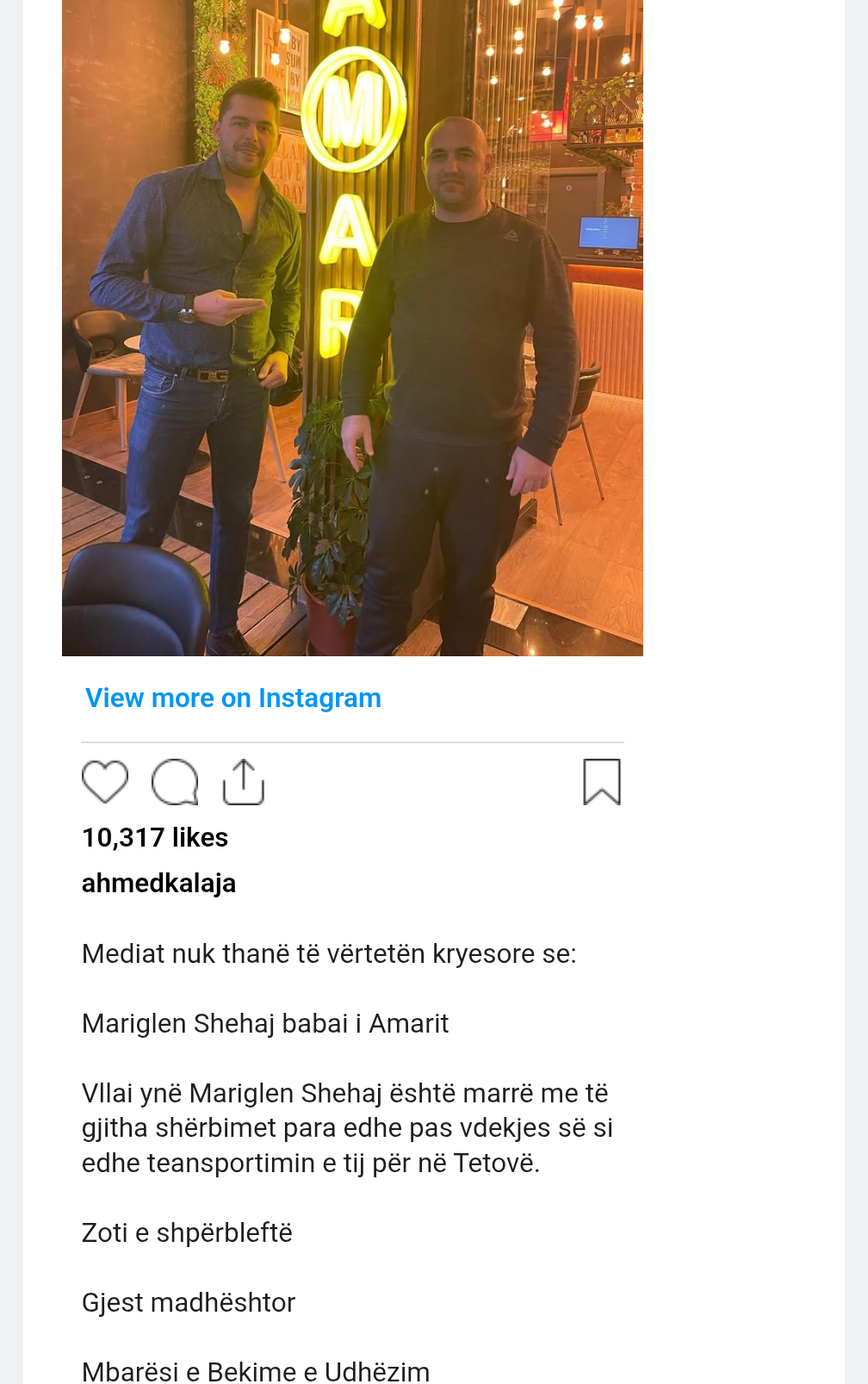 “Mediat nuk thanë të vërtetën kryesore se: Mariglen Shehaj babai i Amarit. Vllai ynë Mariglen Shehaj është marrë me të gjitha shërbimet para edhe pas vdekjes së si edhe teansportimin e tij për në Tetovë. Zoti e shpërbleftë,” shkruan ai, duke kërkuar që merita t’i njihet Shehajt.