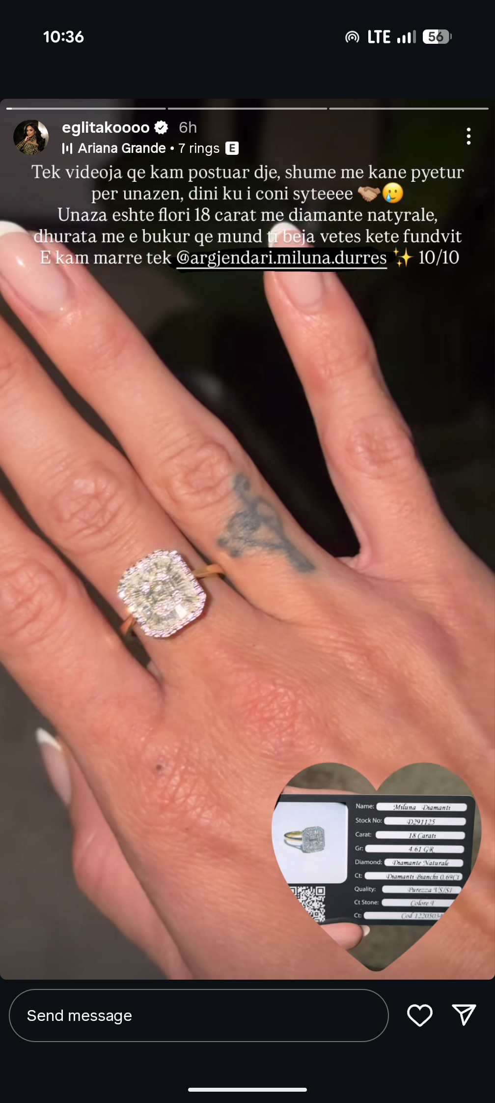 “Tek videoja që kam postuar dje, shumë më kanë pyetur për unazën… dhurata më e bukur që mund t’i bëja vetes këtë fundvit,” shkroi ajo, duke treguar se e ka blerë vetë.
