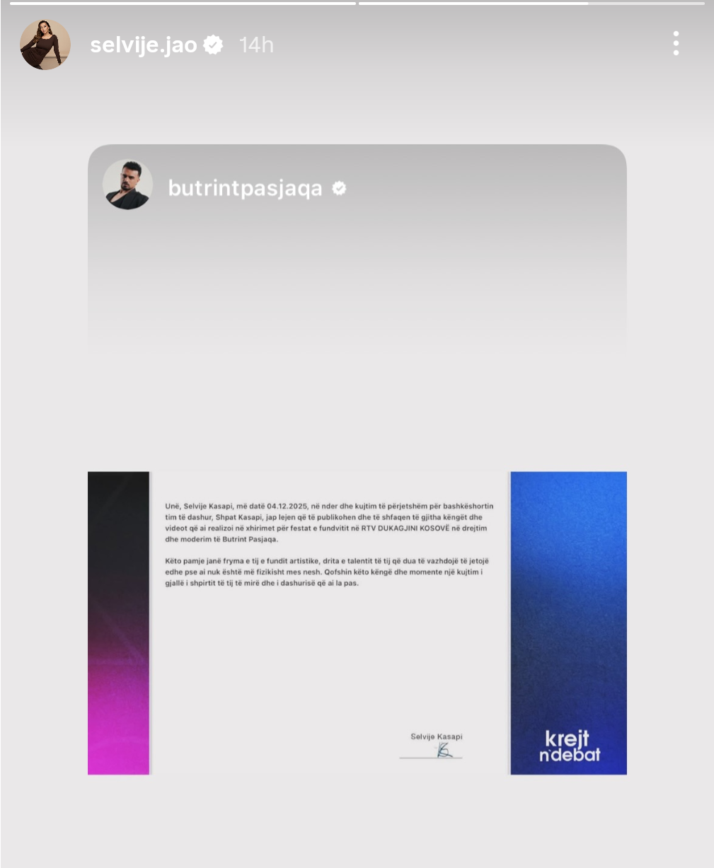 Në deklaratën e firmosur prej saj drejtuar RTV Dukagjinit dhe producentit Butrint Pasjaqa, Selvije shprehet me fjalë prekëse: