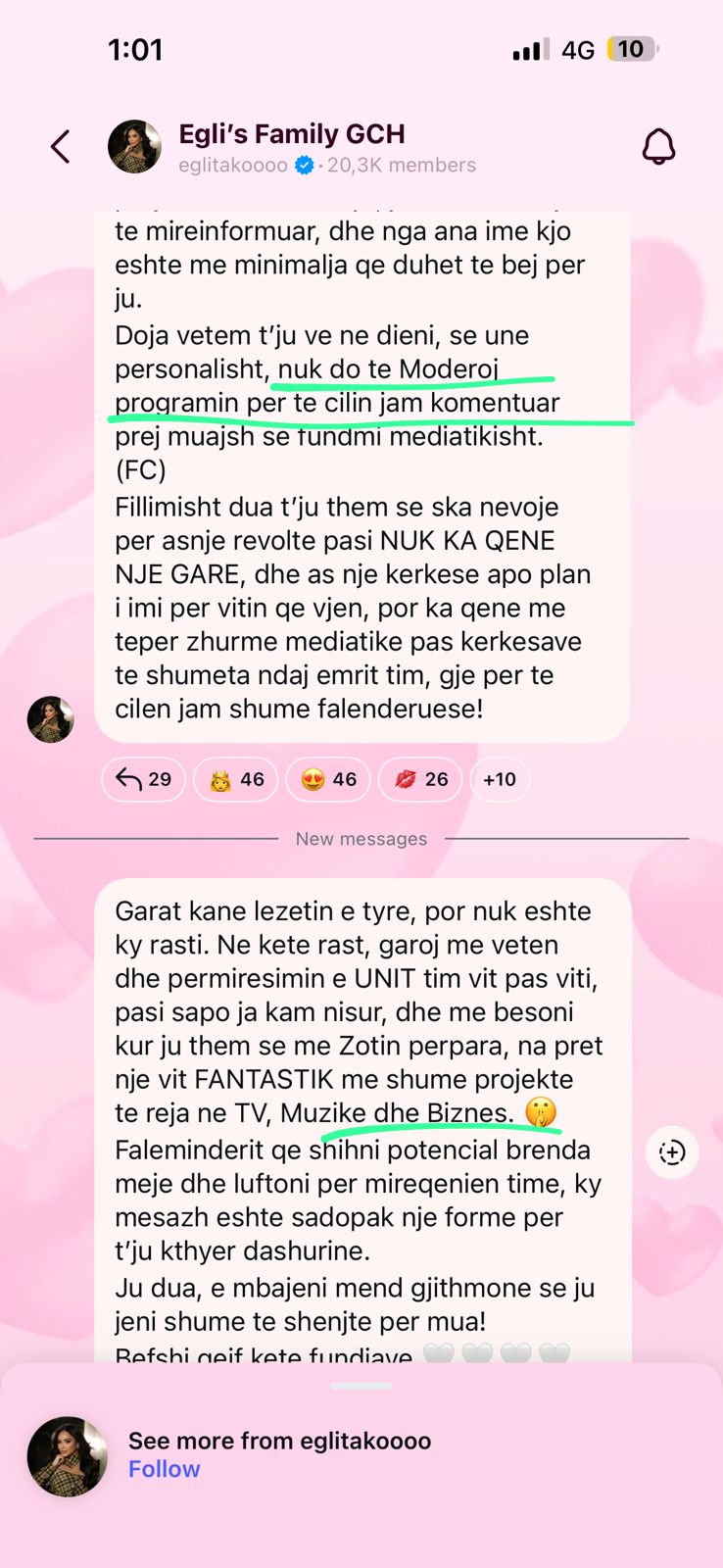 Përmes një mesazhi drejtuar ndjekësve të saj, Egli deklaroi prerë se nuk do ta moderojë programin në fjalë, duke theksuar se e gjitha ka qenë një zhurmë mediatike dhe jo një plan apo garë e saj për vitin që vjen.
