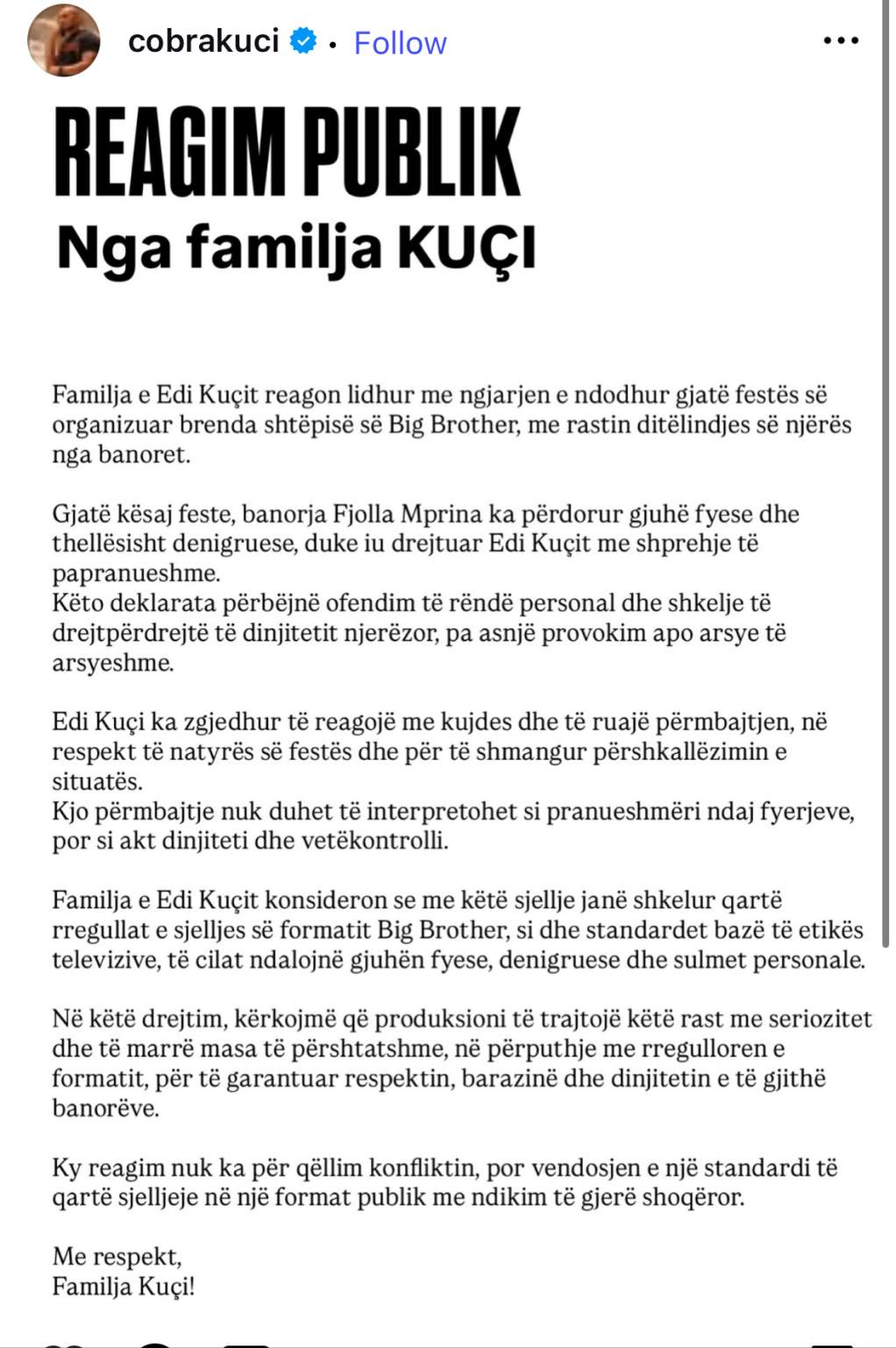 Pas këtij episodi, familja Kuçi ka publikuar një reagim zyrtar, duke e dënuar sjelljen e Morinës si “gjuhë fyese dhe thellësisht denigruese” dhe duke i cilësuar shprehjet e saj si të papranueshme.