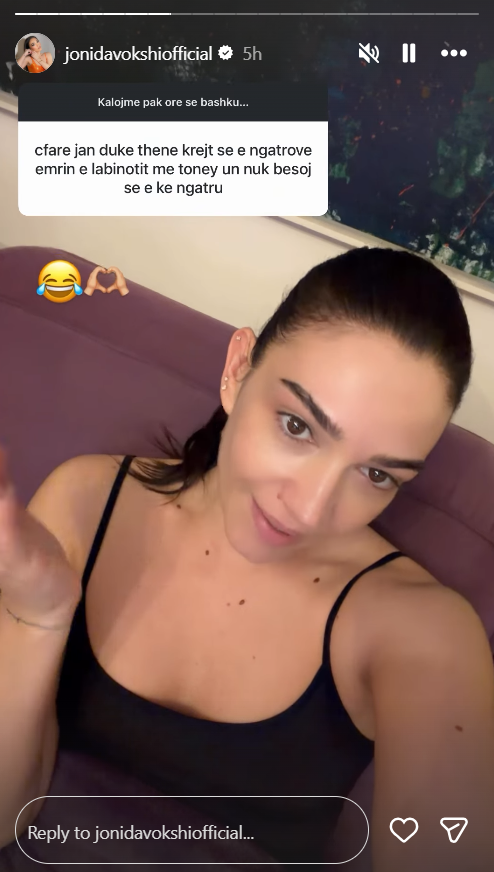 Jonida ka zgjedhur të përgjigjet me nota humori dhe ironie, pa dhënë një shpjegim të qartë. Ajo ka publikuar një video ku shfaqet e buzëqeshur, duke e shoqëruar postimin me emojin duke qeshur me lot “😂” dhe atë të duarve zemër “🫶”.