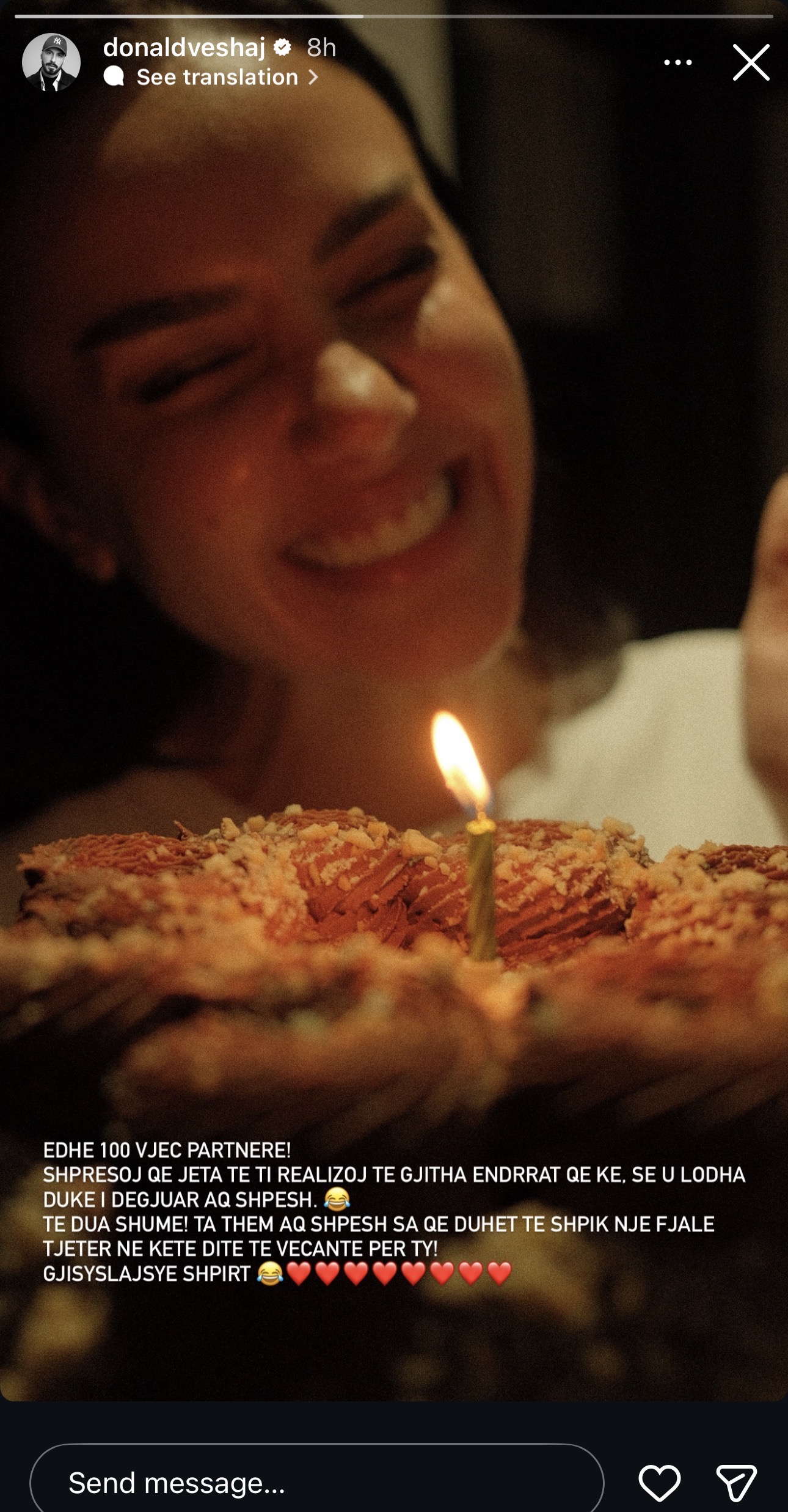 “Edhe 100 vjeç partnere! Shpresoj që jeta të t’i realizojë të gjitha ëndrrat që ke. Se u lodha duke i dëgjuar aq shpesh,” shkruan Donaldi me shaka, duke e ngacmuar për planet e saj të shumta.