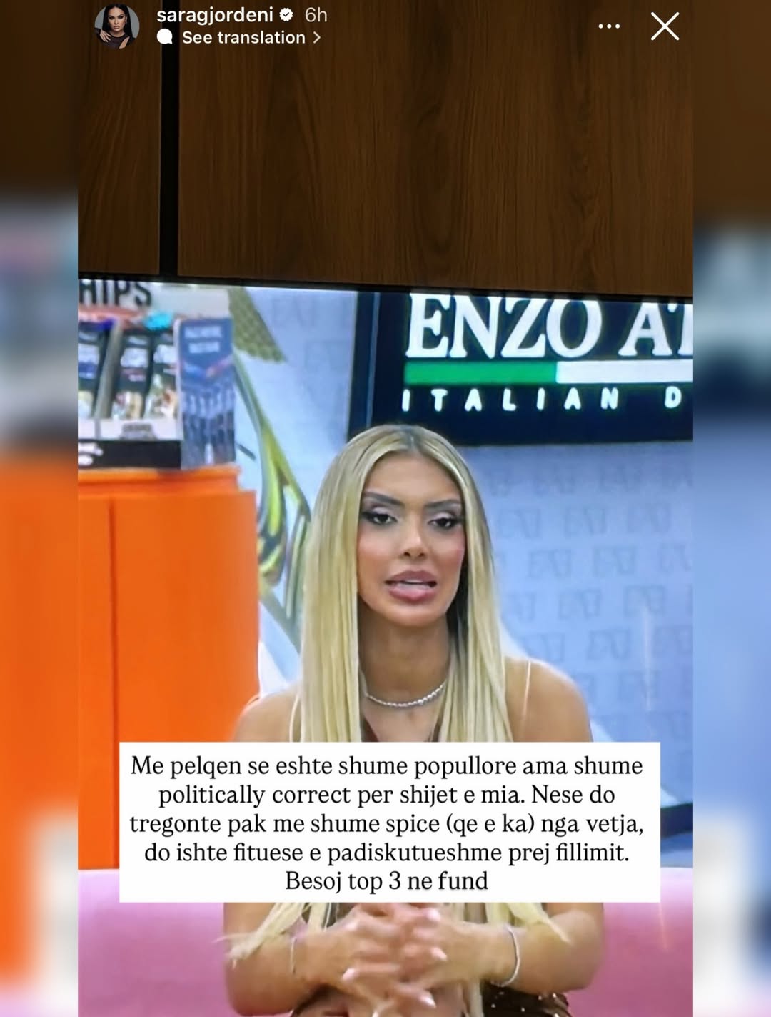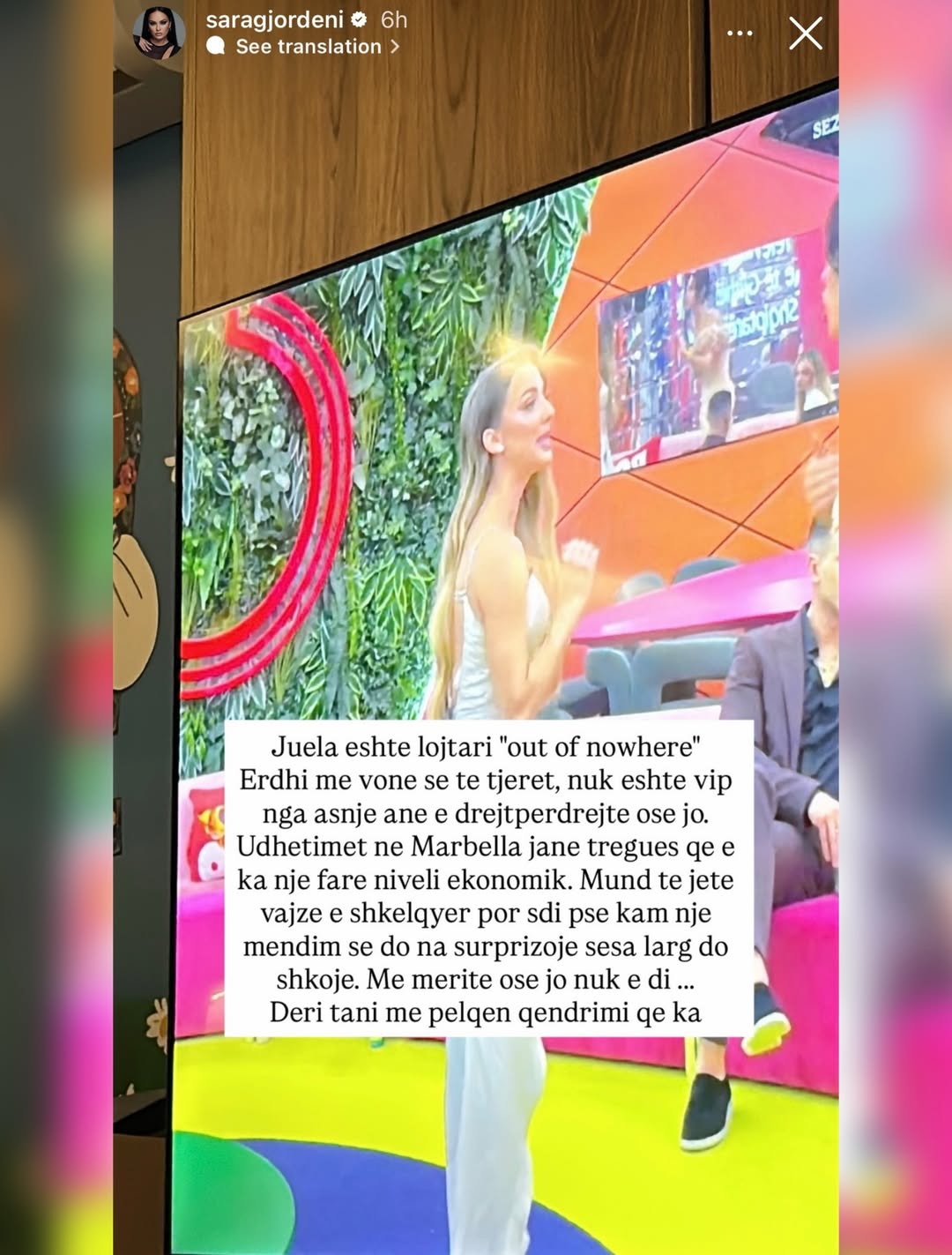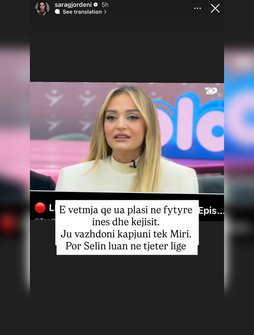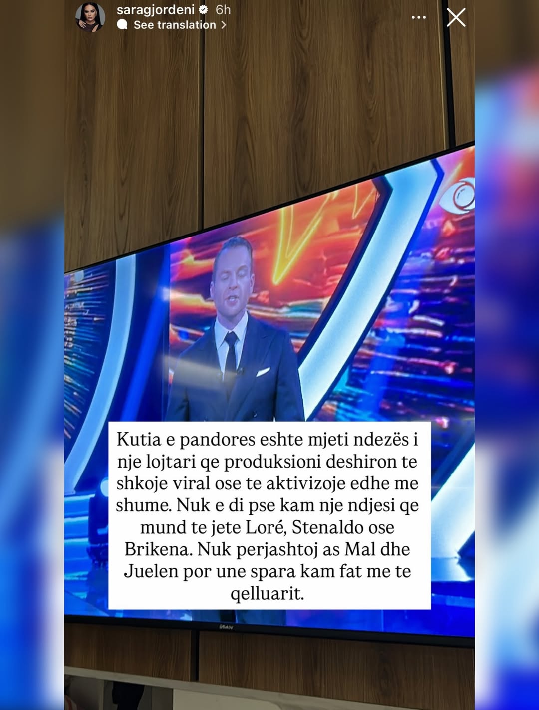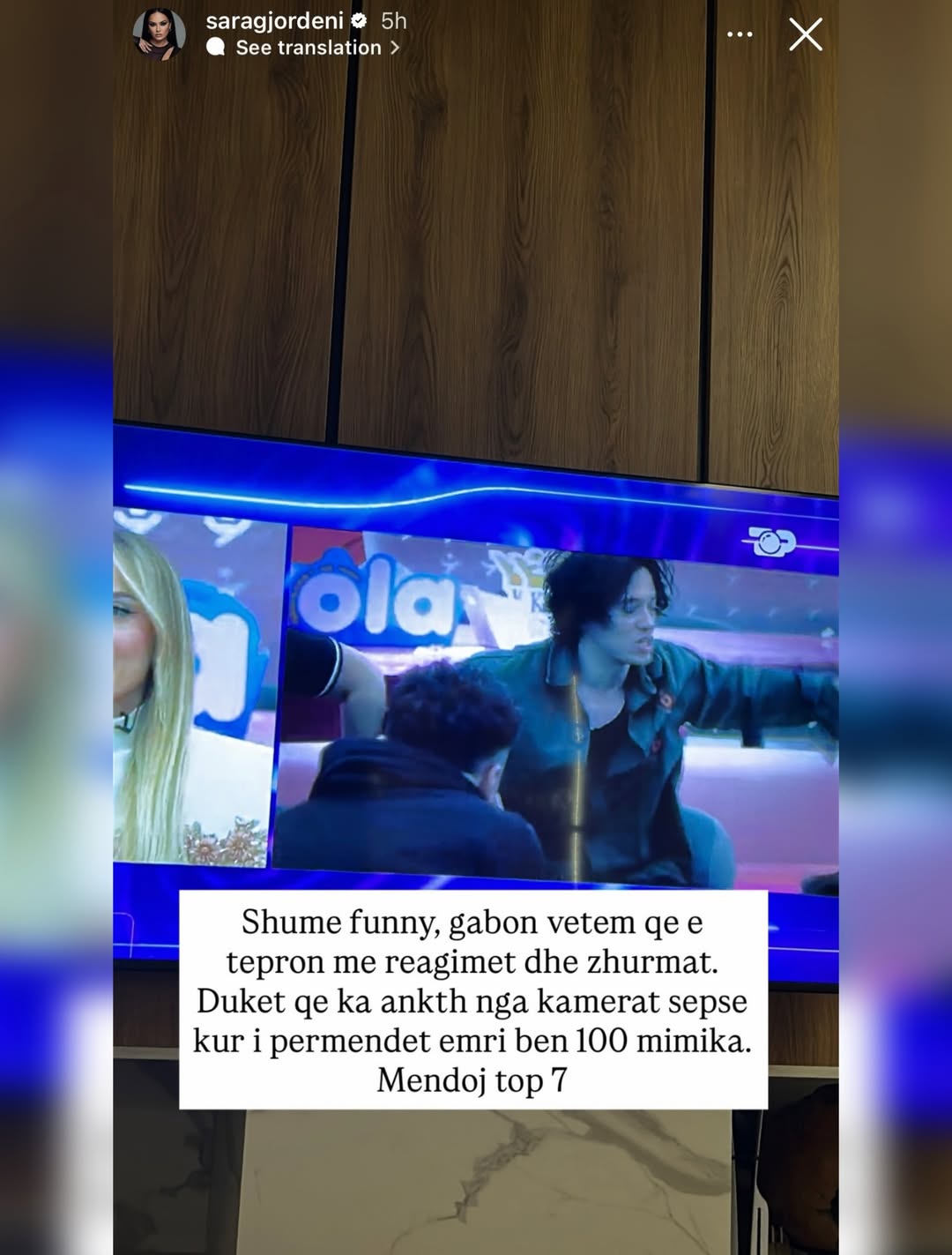 Ish-banorja e “Big Brother VIP 3”, Sara Gjordeni, e ka ndjekur me vëmendje spektaklin e mbrëmshëm të “BBVA 5” dhe nuk i ka kursyer komentet e drejtpërdrejta për banorët dhe dinamikat e shtëpisë përmes disa postimeve në Instastory.