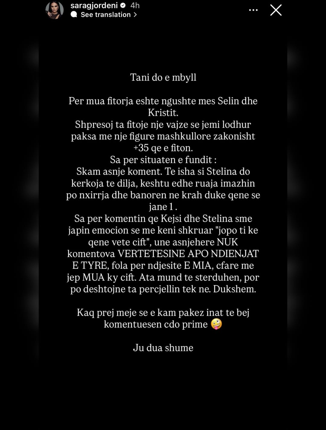 “Për mua fitorja është ngushtë mes Selin dhe Kristit,” shkroi ajo në postimin përmbyllës.