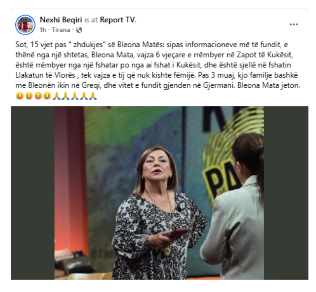 Sot, 15 vjet pas ” zhdukjes” së Bleona Matës: sipas informacioneve më të fundit, e thënë nga një shtetas, Bleona Mata, vajza 6 vjeçare e rrëmbyer në Zapot të Kukësit, është rrëmbyer nga një fshatar po nga ai fshat i Kukësit, dhe është sjellë në fshatin Llakatun të Vlorës , tek vajza e tij që nuk kishte fëmijë. Pas 3 muaj, kjo familje bashkë me Bleonën ikin në Greqi, dhe vitet e fundit gjenden në Gjermani. Bleona Mata jeton.