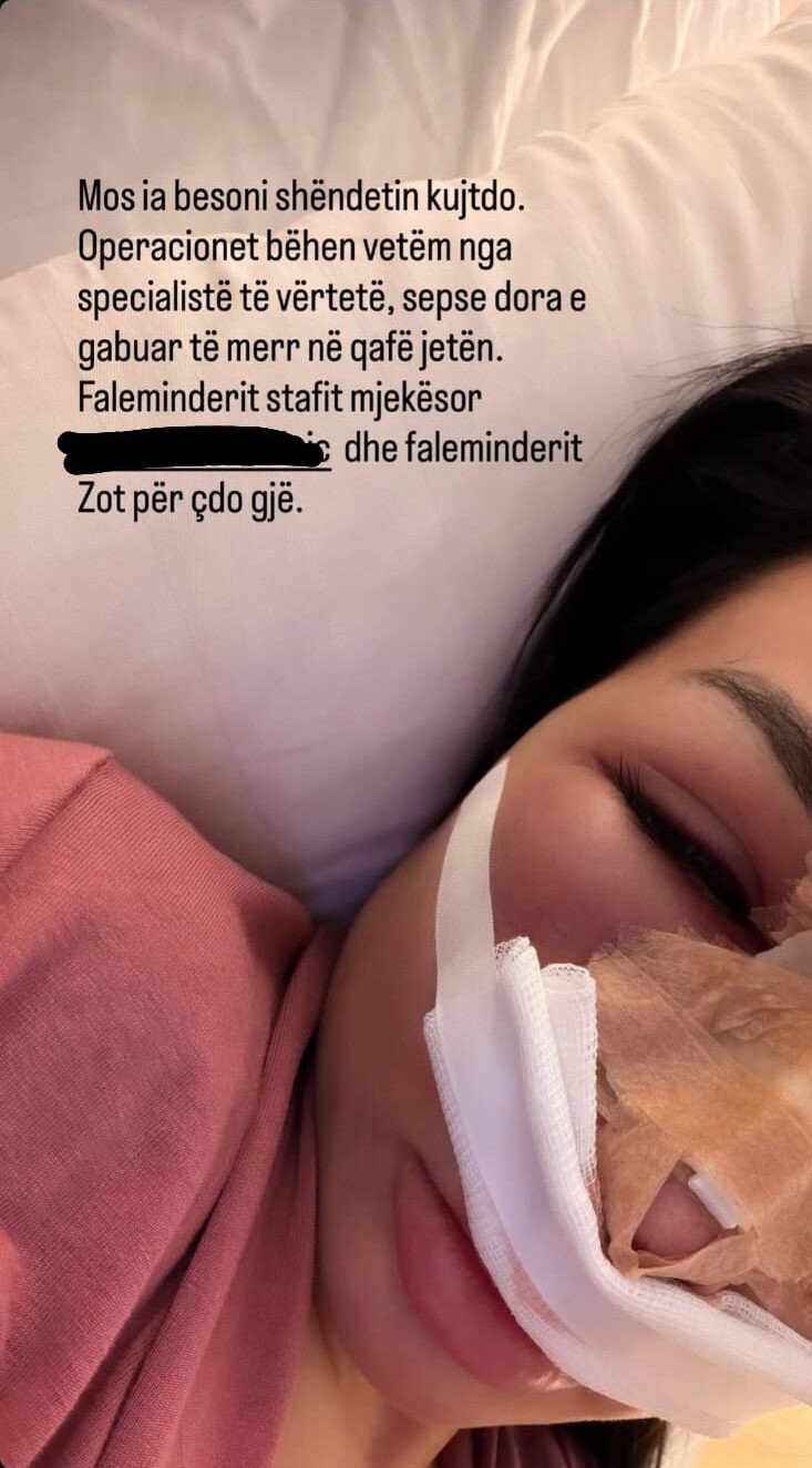 “Mos ia besoni shëndetin kujtdo. Operacionet bëhen vetëm nga specialistë të vërtetë, sepse dora e gabuar të merr në qafë jetën,” shkroi ajo krahas fotos, duke lënë të kuptohet se rasti i saj ka qenë delikat.